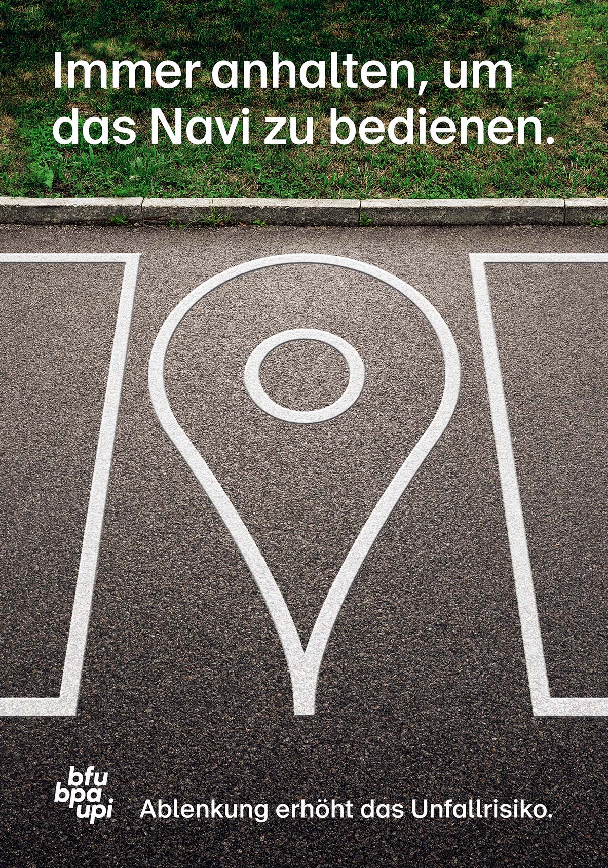 Ablenkung am Steuer führt zu Verkehrsunfällen. Darum zeigt die neue BFU-Kampagne von Ruf Lanz mit ungewöhnlichen Parkfeldern: Immer anhalten bei Ablenkung.