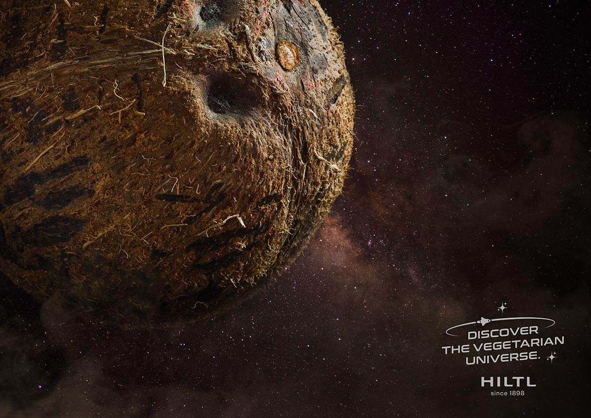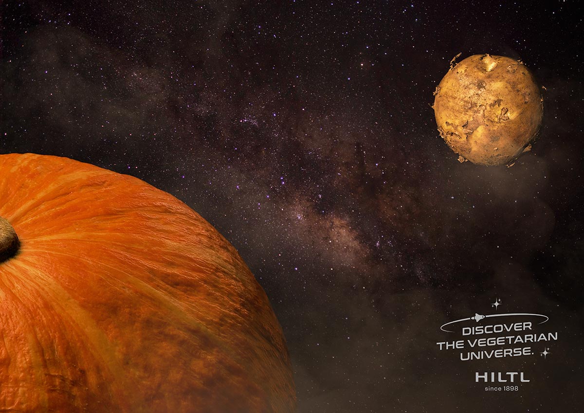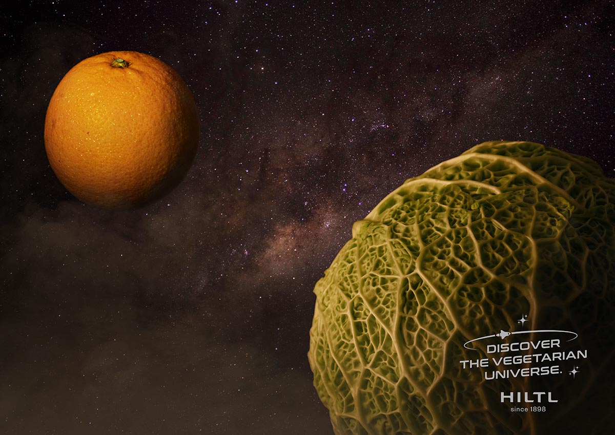 Das vegetarische Universum wird lanciert auf Plakaten, Kinodias, Anzeigen, Postkarten, einem Falzflyer mit digitaler Reise durchs Hiltl Universum und einem Sammelpass. Um auch die wieder nach Zürich kommenden Touristinnen und Touristen anzusprechen, erscheint die Kampagne in englisch.