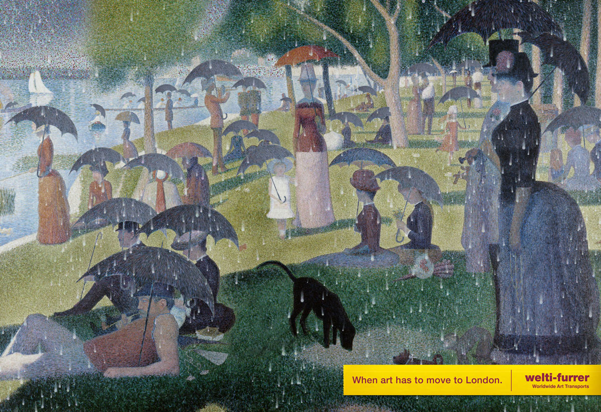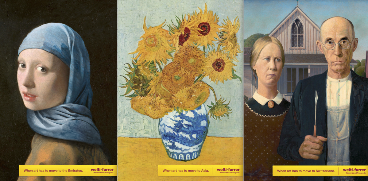 Zum einen die Kampagne «Worldwide Art Transports». Sie zeigt anhand von ikonischen Gemälden mit verblüffenden Abweichungen, dass Kunst mit Welti-Furrer überall gut ankommt. In den Arabischen Emiraten, in Asien, in der Schweiz, in London, usw. Welti-Furrer übernimmt dabei die komplette Logistik und kümmert sich um Transport, Auf- und Abbau, Installation und alle Zollformalitäten.