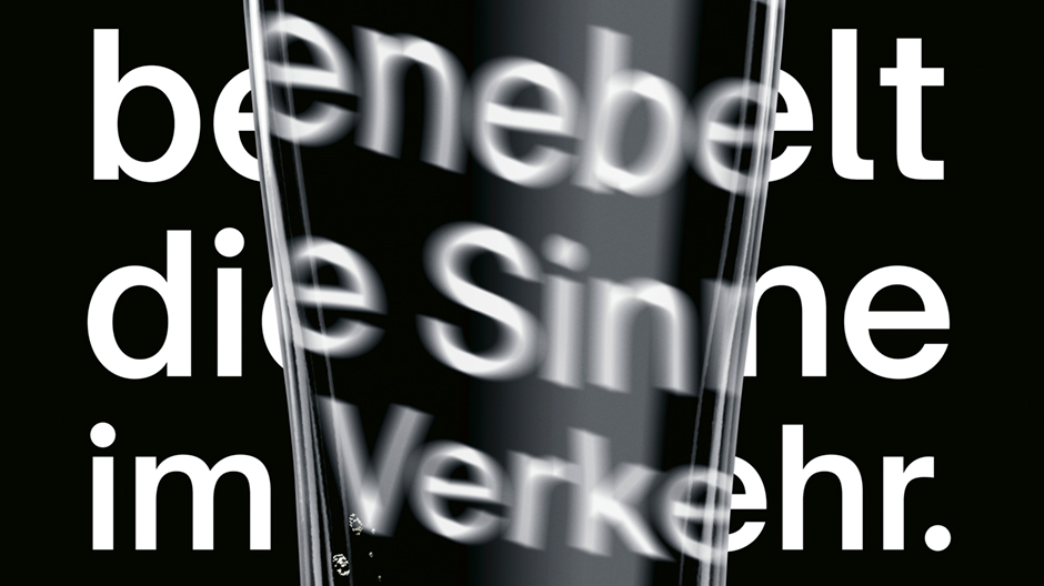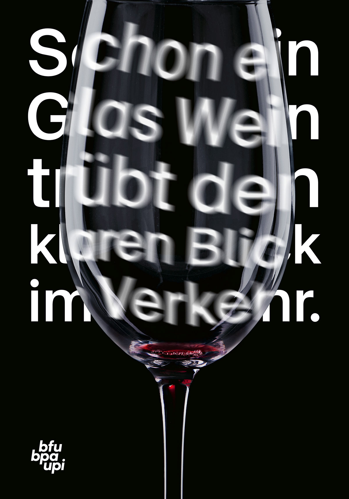 Die Kreativagentur veranschaulicht den Effekt des Alkohols, indem sie ein leergetrunkenes Glas Bier, Wein und Prosecco vor plakative Schlagzeilen stellt. Dadurch tritt genau die verzerrende, benebelnde und trübende Wirkung ein, die Alkohol im Strassenverkehr hat.