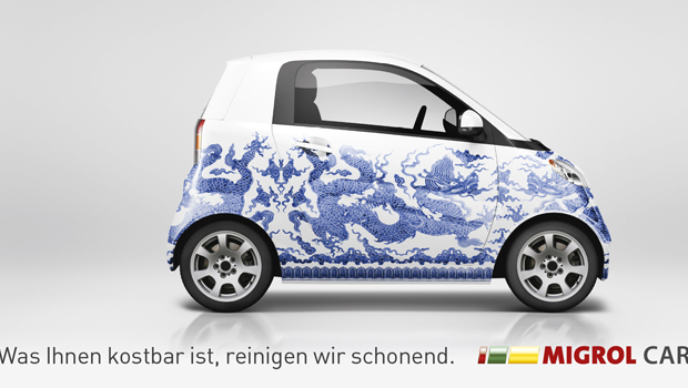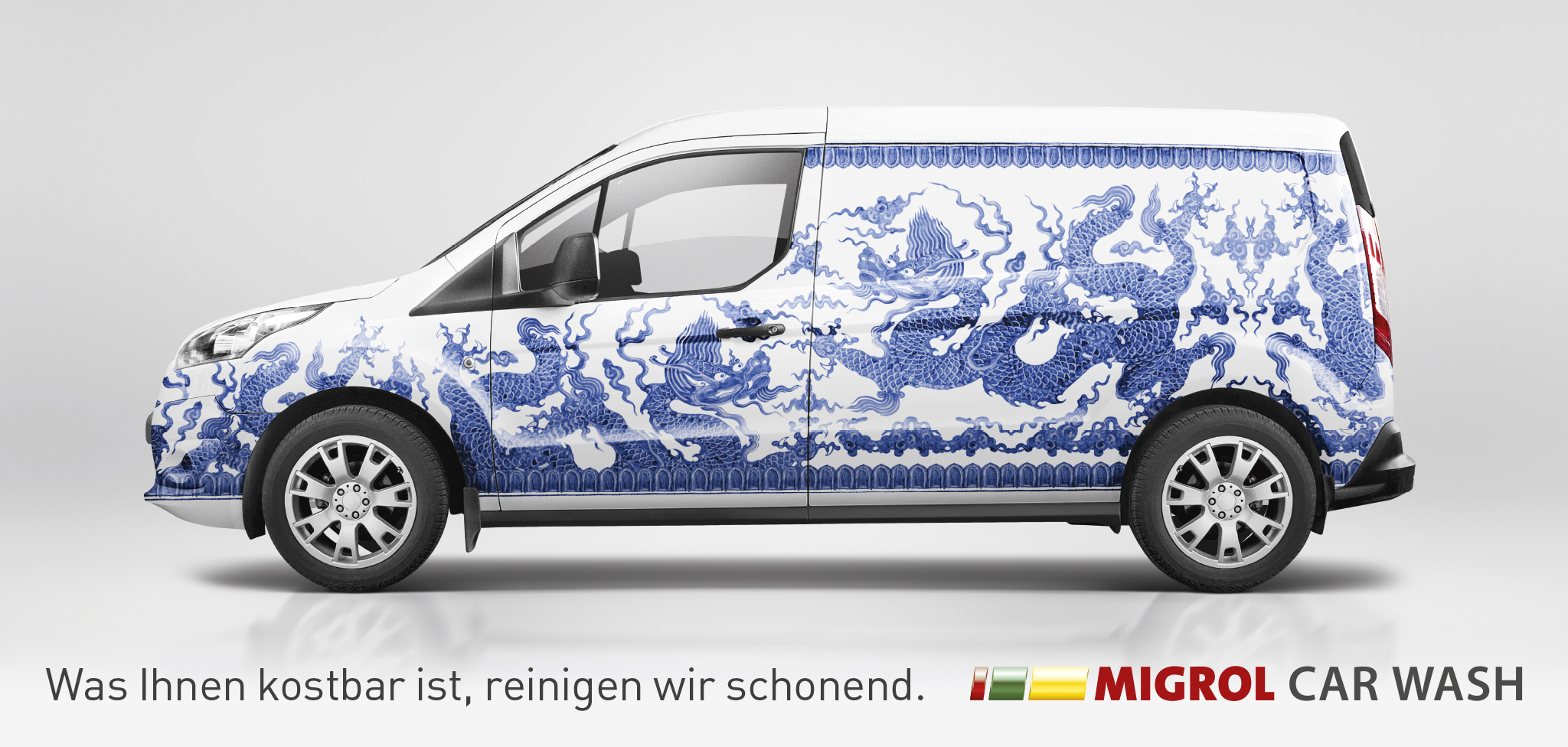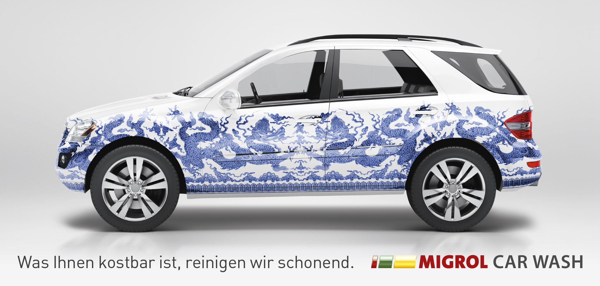Die Botschaft lautet: Was Ihnen kostbar ist, reinigen wir schonend. Denn bei Migrol Car Wash kommt nur lack- und umweltschonende Waschtechnologie zum Einsatz. Um diesen Kundennutzen verblüffend zu inszenieren, haben die Kreativen Autos im Stil kostbarer Ming-Porzellanvasen bemalt. Damit keine Zielgruppe auf der Strecke bleibt, wurden die verschiedensten Fahrzeugtypen berücksichtigt: Vom smarten Kleinwagen über den schnittigen Sportwagen bis zum praktischen Transporter.