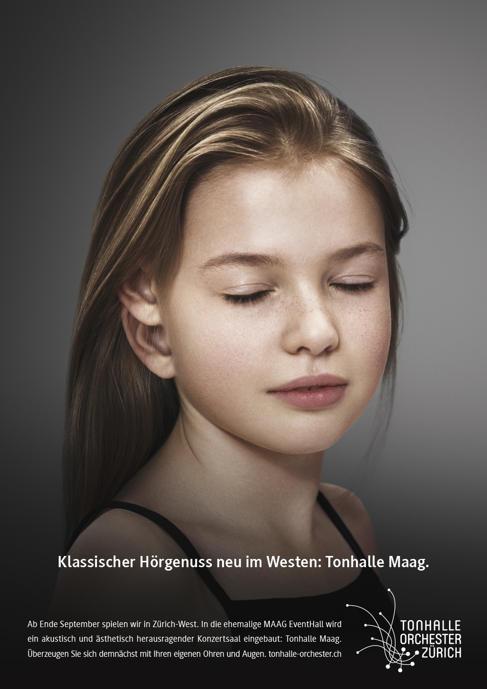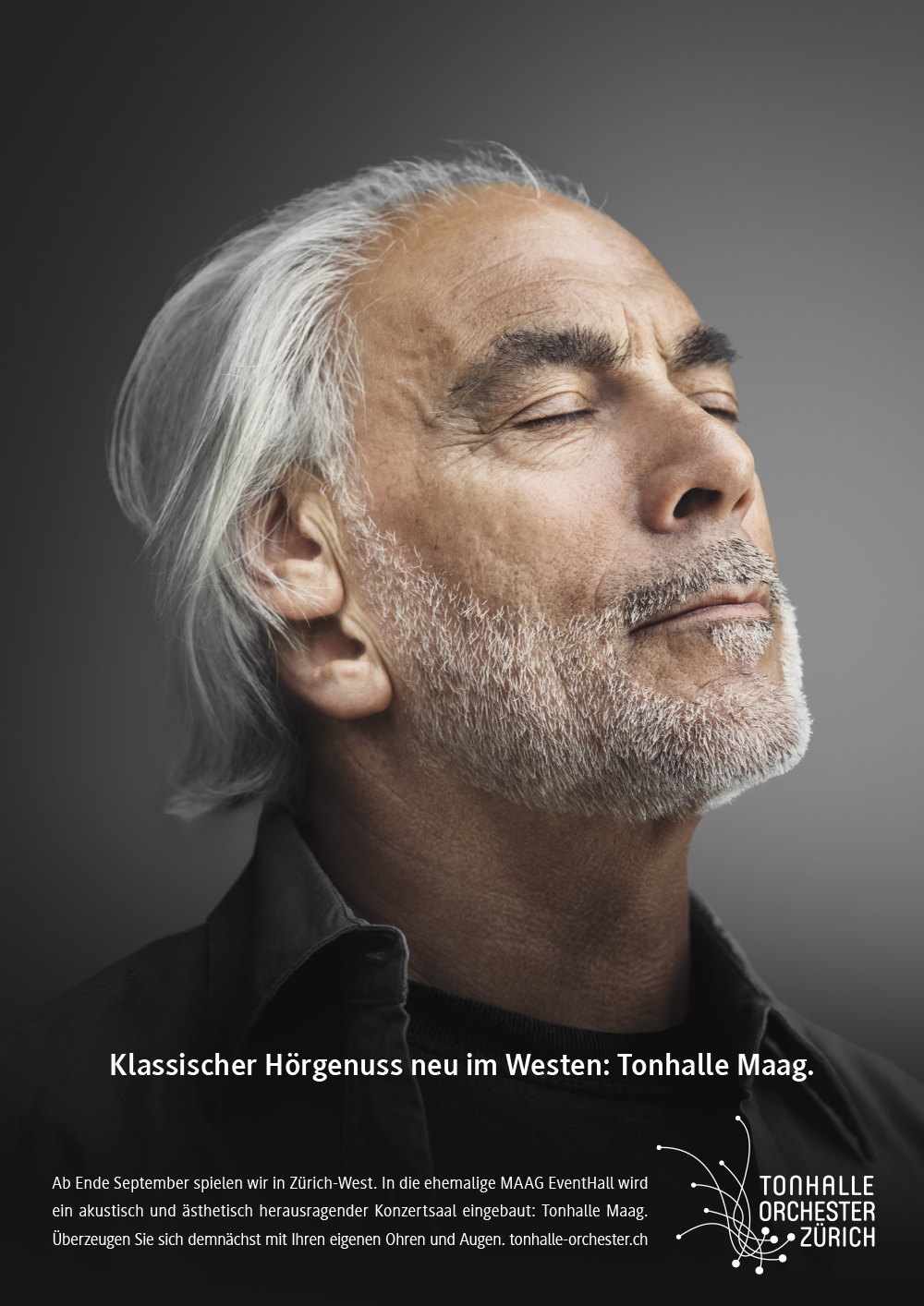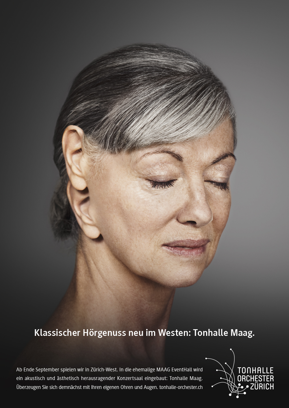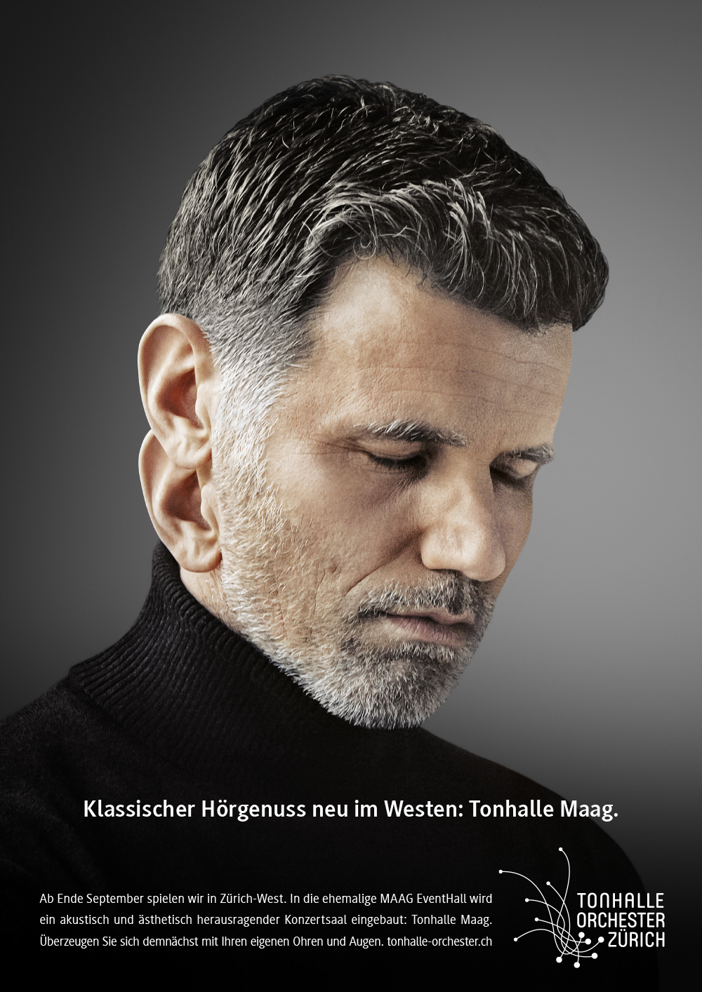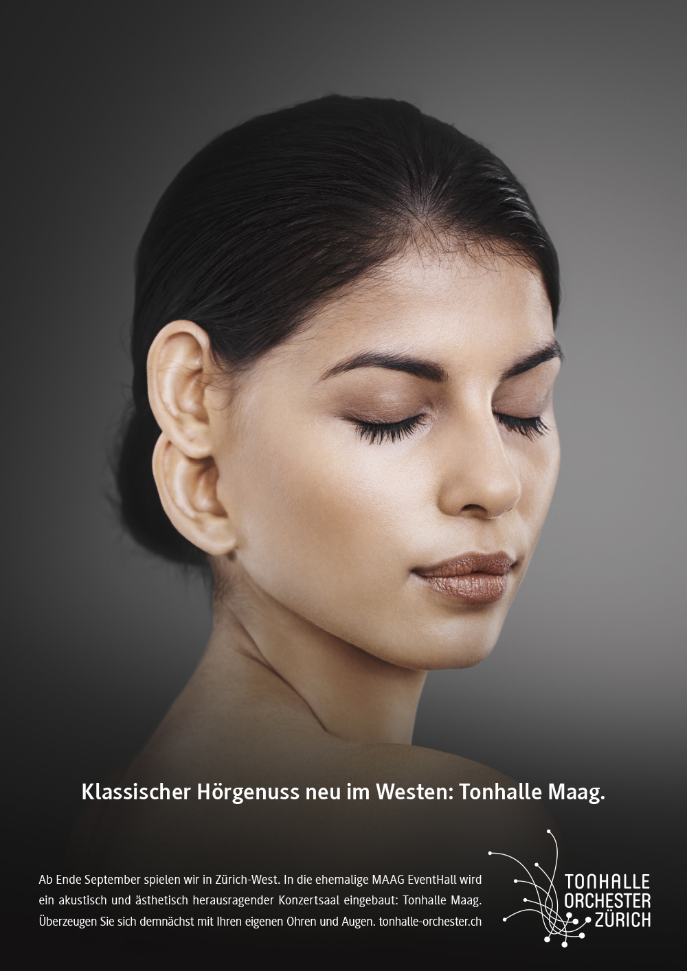 Auch die Kampagne für die neue Spielstätte in Zürich-West fällt durch einen überraschenden Zugang zum Thema auf. Unter dem Motto „Klassischer Hörgenuss neu im Westen“ werden in die Musik versunkene Konzertgängerinnen und Konzertgänger gezeigt, deren Ohren bereits ganz nach Westen ausgerichtet sind.