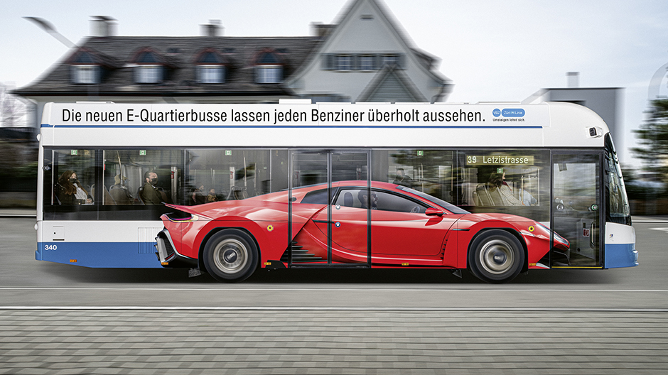 Die Lancierungskampagne stammt von Ruf Lanz, der Leadagentur der VBZ. Die Kreativen bringen die neuen Batteriebusse mit einer auffälligen Aktion in Fahrt. Anhand eines passgenau über die Busräder montierten roten Sportwagens und entsprechender Botschaft auf den Bus-Dachtafeln wird der Bevölkerung plastisch vor Augen geführt, dass Benziner im Quartier jetzt überholt aussehen.