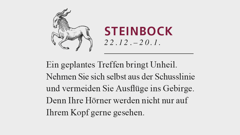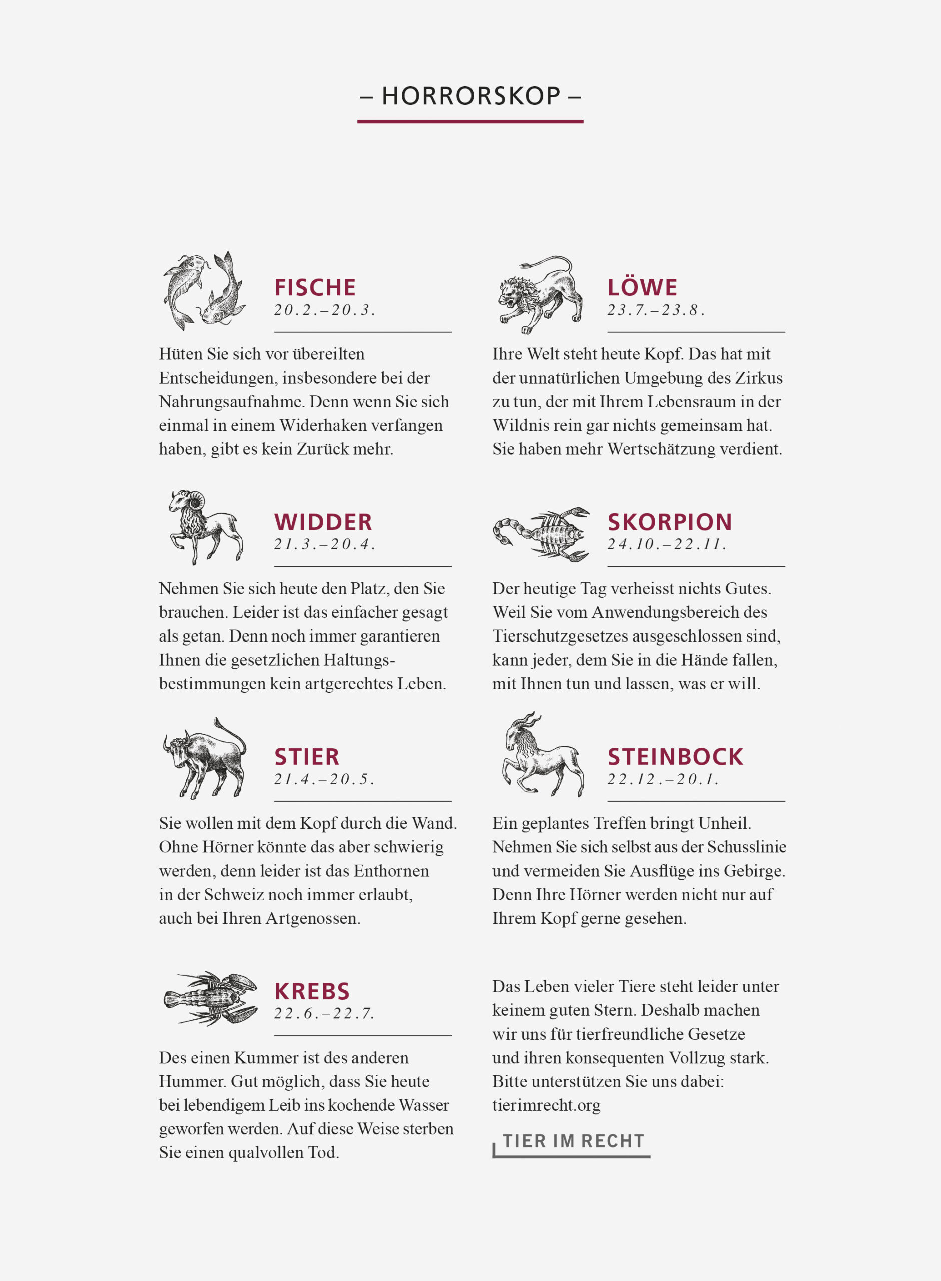 Horoskope erfreuen sich in vielen Zeitungen und Zeitschriften grosser Beliebtheit. Für die Stiftung Tier im Recht (TIR) nutzt Ruf Lanz die Tiersternzeichen einmal anders. In einem täuschend echten «Horrorskop» macht die Stiftung darauf aufmerksam, dass das Schicksal von Löwe, Stier, Steinbock, Fisch, Krebs usw. oft unter einem ungünstigen Stern steht.