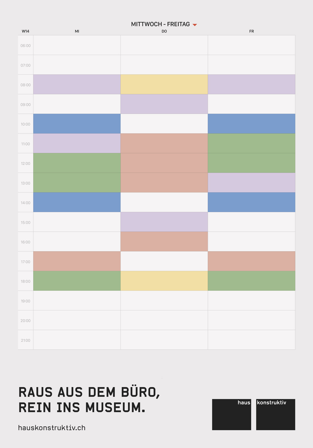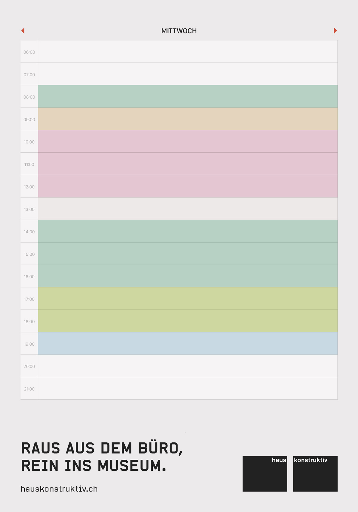 Nun zeichnet die Kreativagentur für einen weiteren Auftritt verantwortlich. Darin werden die Manager in den umliegenden Geschäftsvierteln anhand ihrer elektronischen Terminkalender daran erinnert, sich doch mal eine Pause von der ganzen Hektik zu gönnen: mit konkreter Kunst ganz in der Nähe. Denn das Haus Konstruktiv liegt nur wenige Minuten von Bahnhofstrasse, Paradeplatz und Stauffacher entfernt.