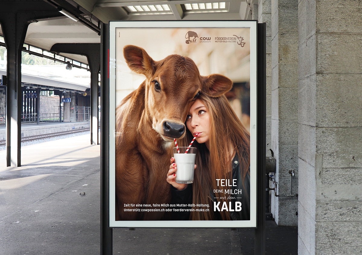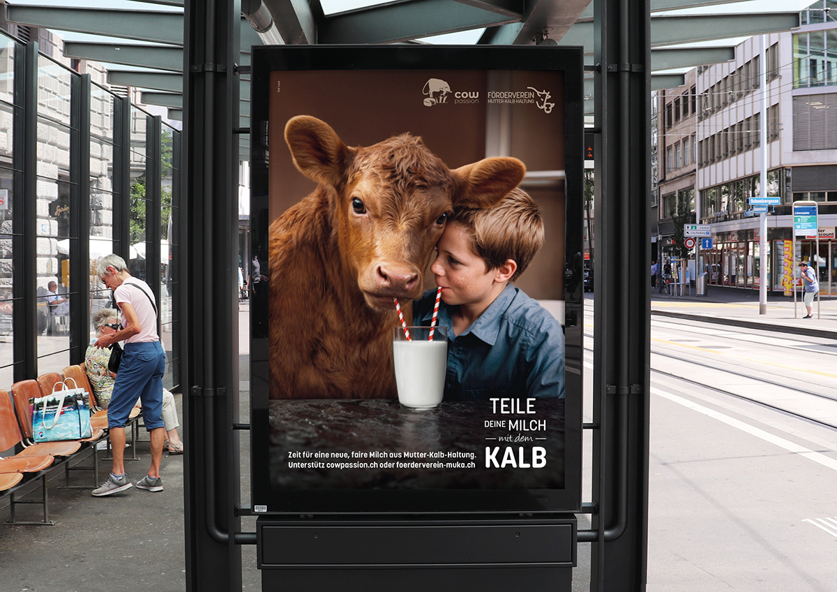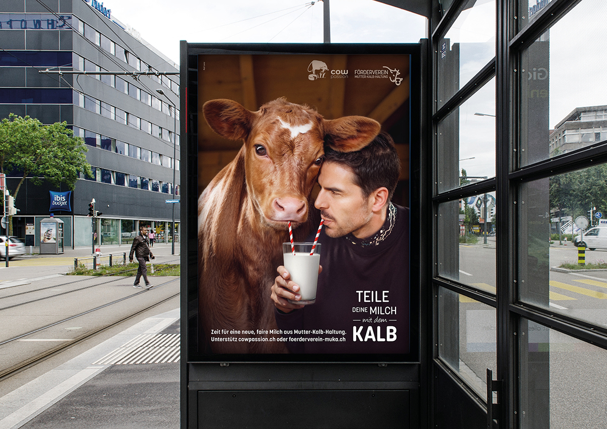 «Teile deine Milch mit dem Kalb», lautet deshalb der prägnante Leitsatz der Sensibilisierungskampagne, die von der Kreativagentur Ruf Lanz entwickelt wurde. Die Botschaft wird auffällig inszeniert am Beispiel von drei Menschen, die ihre Milch liebevoll mit einem Kälbchen teilen.