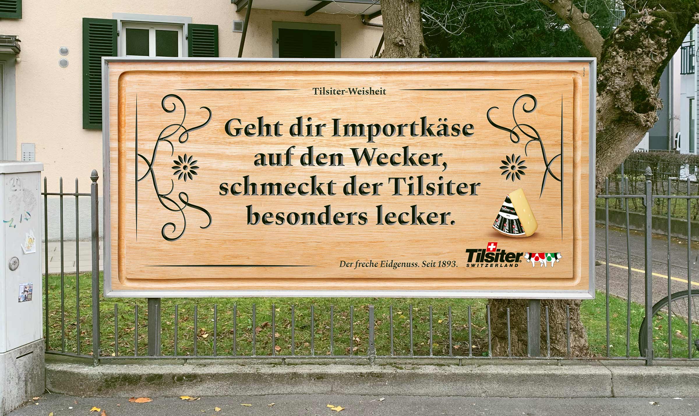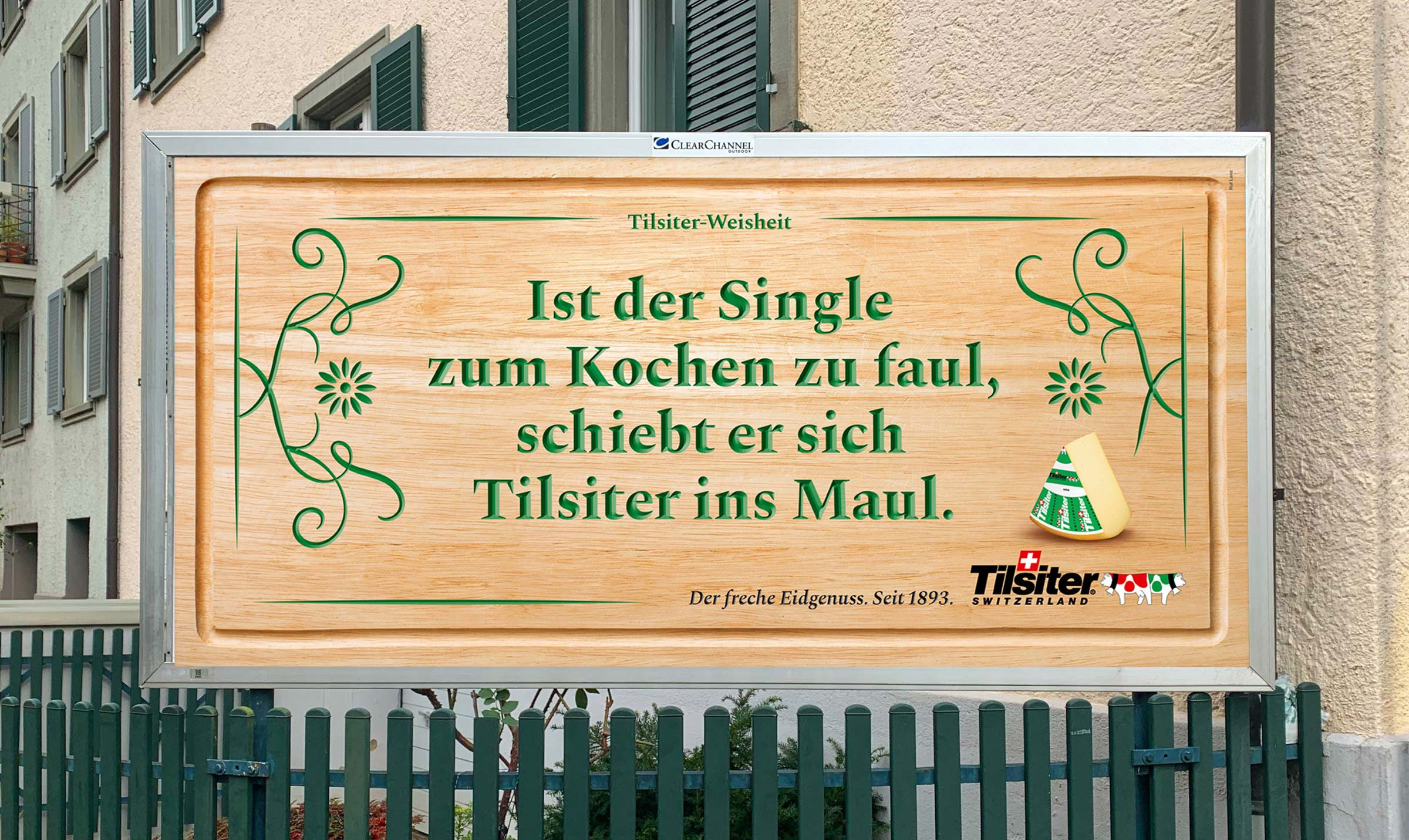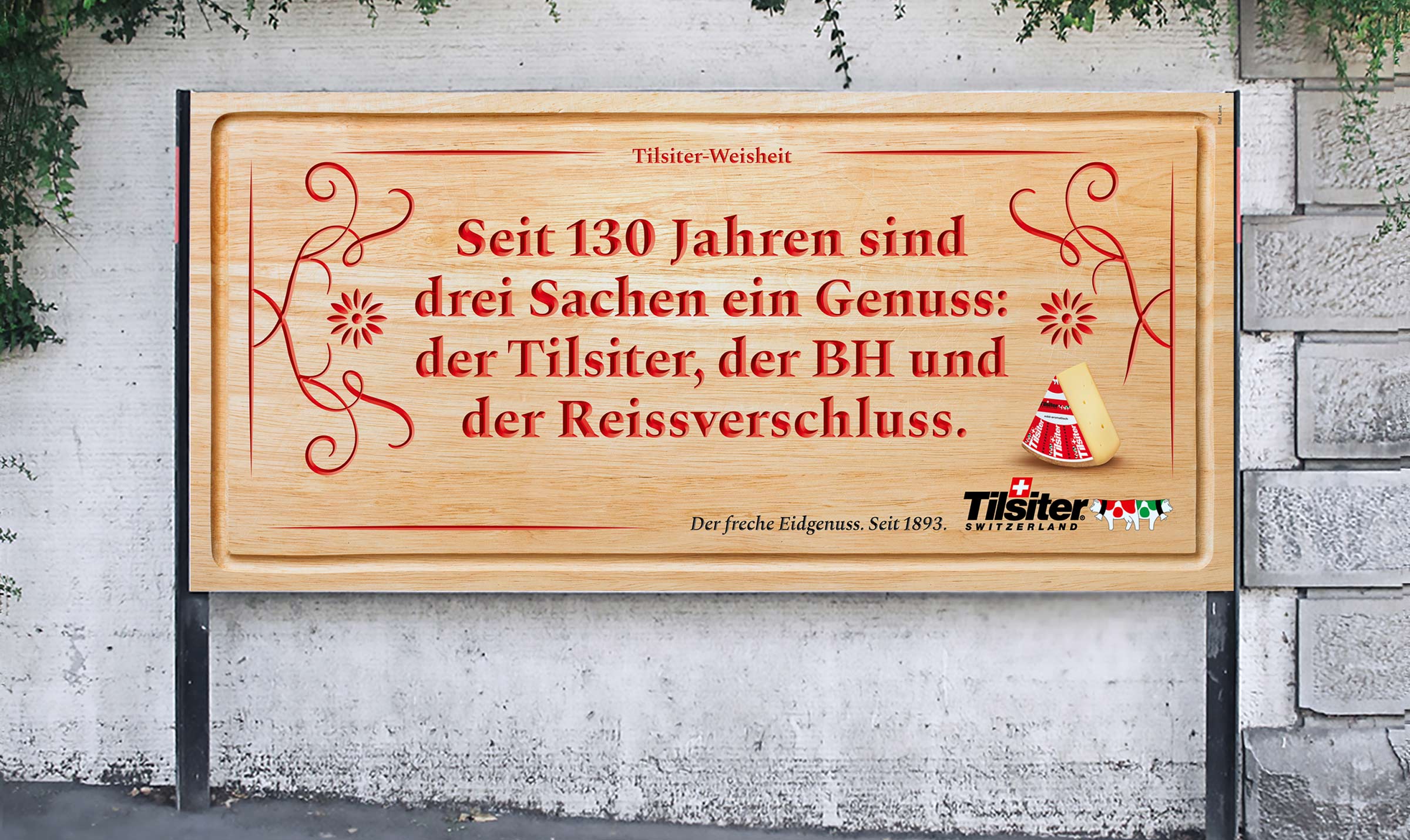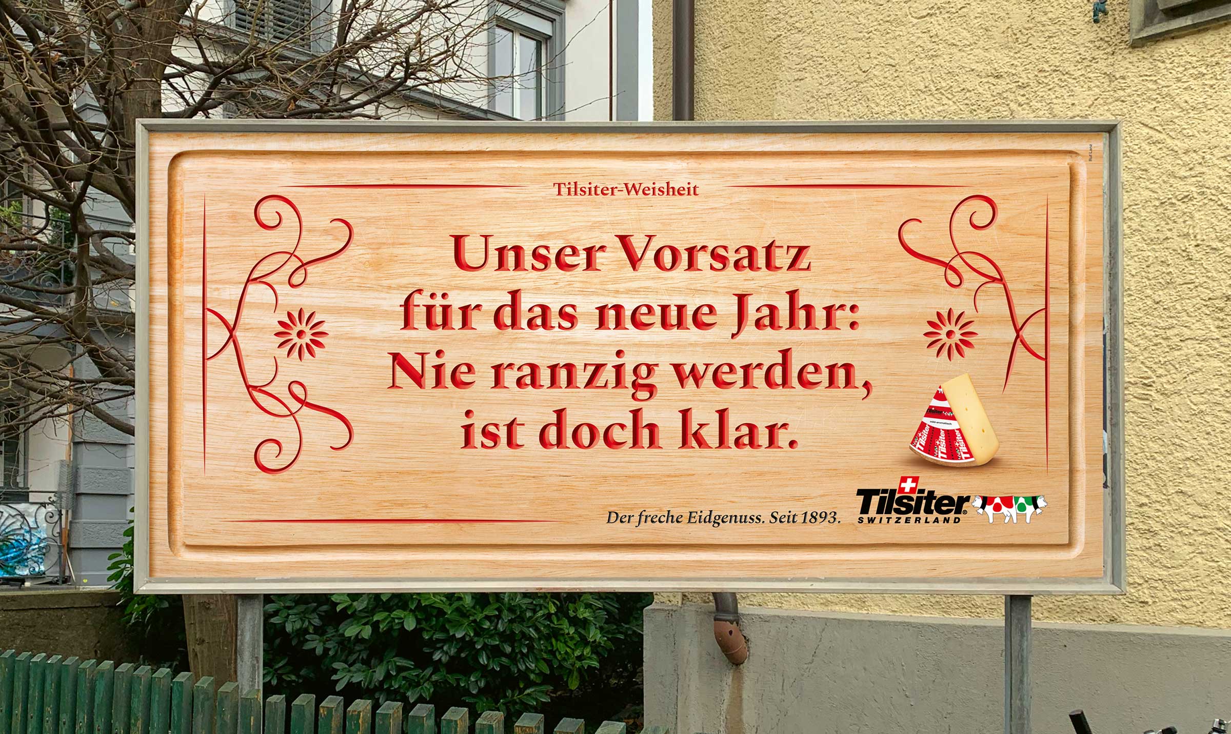 Seit Jahresanfang sind die ersten 15 Tilsiter-Weisheiten auf Plakatwänden in der ganzen Deutschschweiz zu sehen. Darunter finden sich augenzwinkernde Anspielungen auf aktuelle Ereignisse und Themen sowie standortbezogene Spezialsujets. Etwa das Strassenplakat «Vorsicht, Blitzer, langsam fahren, das Geld besser für Tilsiter sparen» oder der neckische Gruss in die urbanen Zentren: «In der Stadt sind alle trendy, bestellen den Tilsiter nur übers Handy».