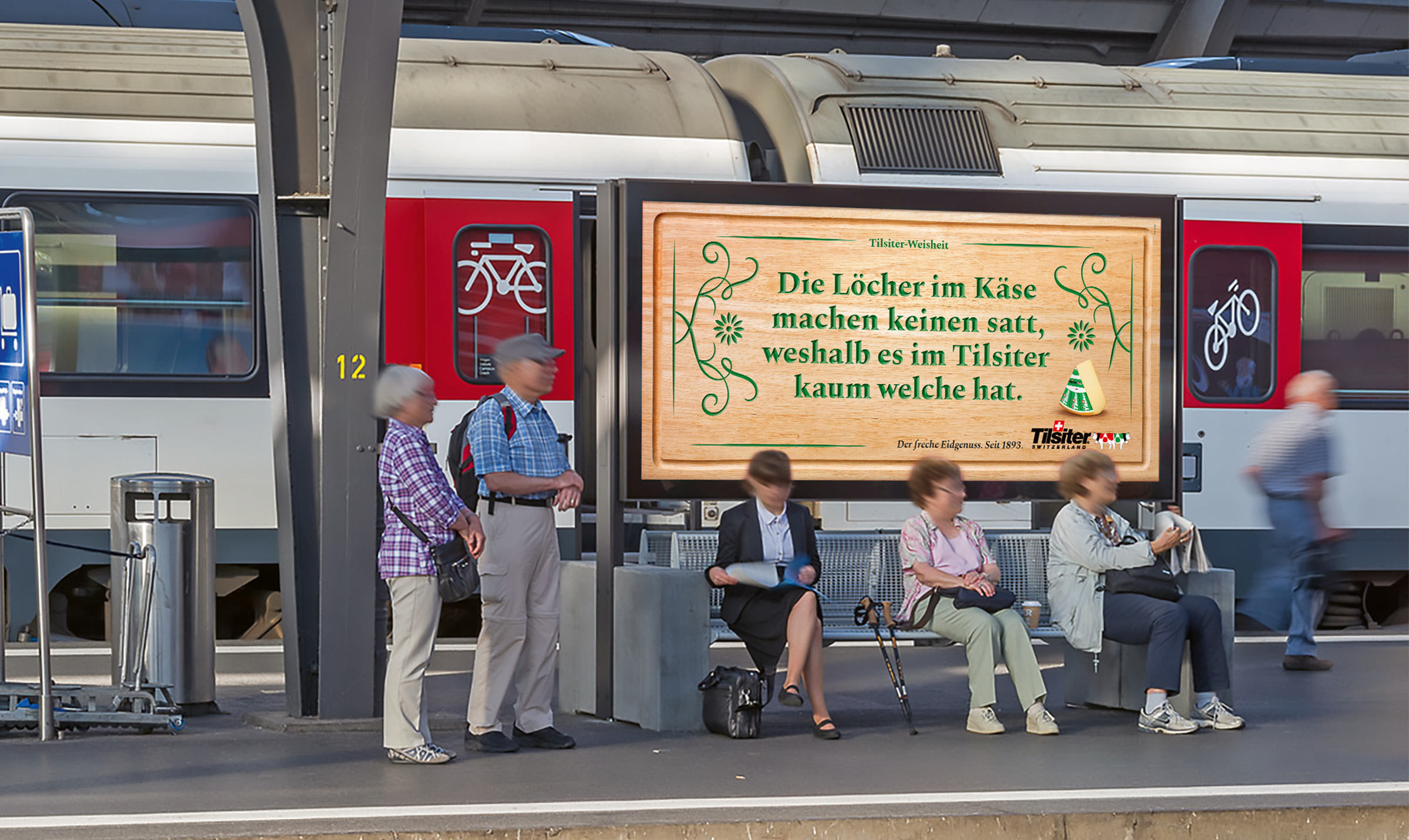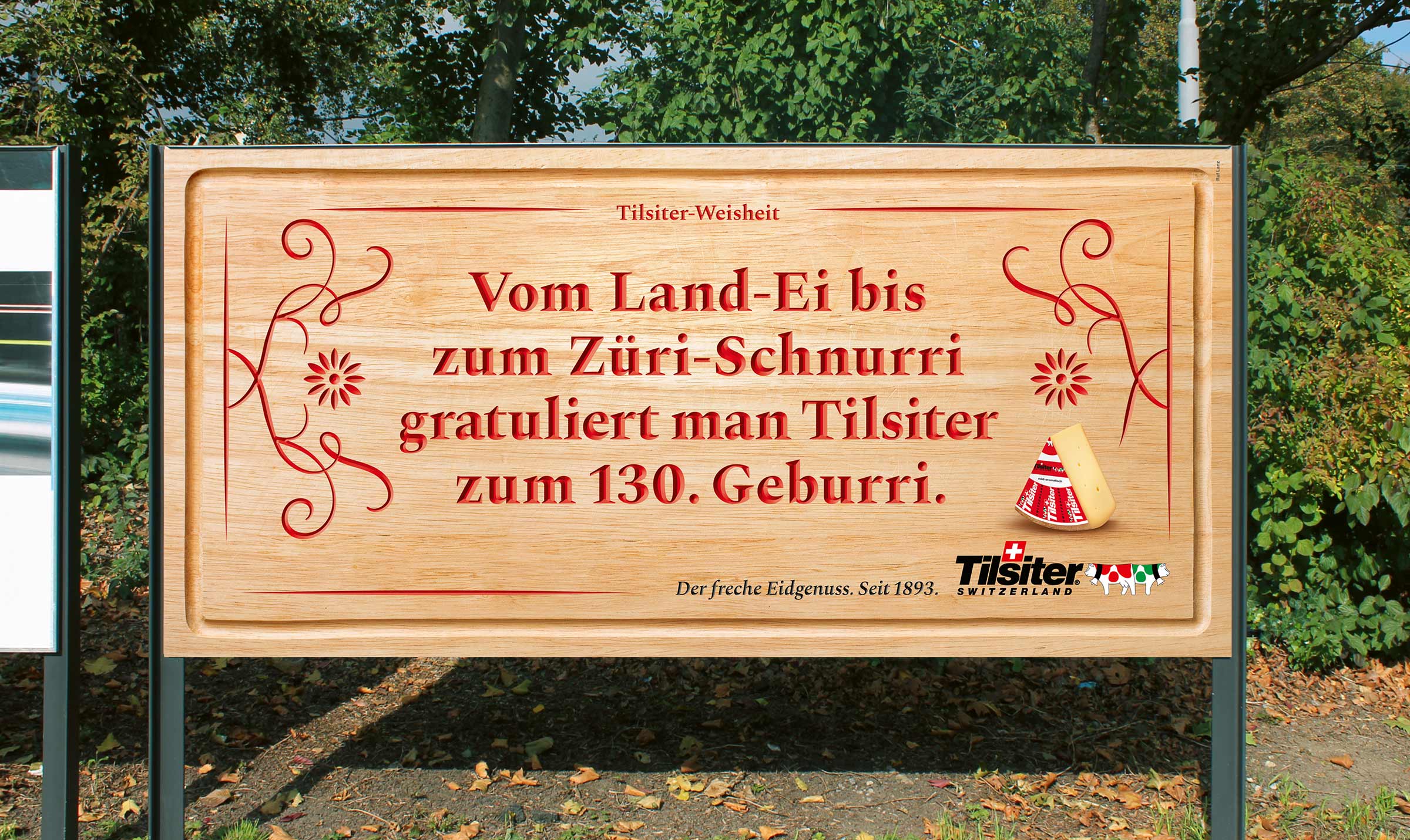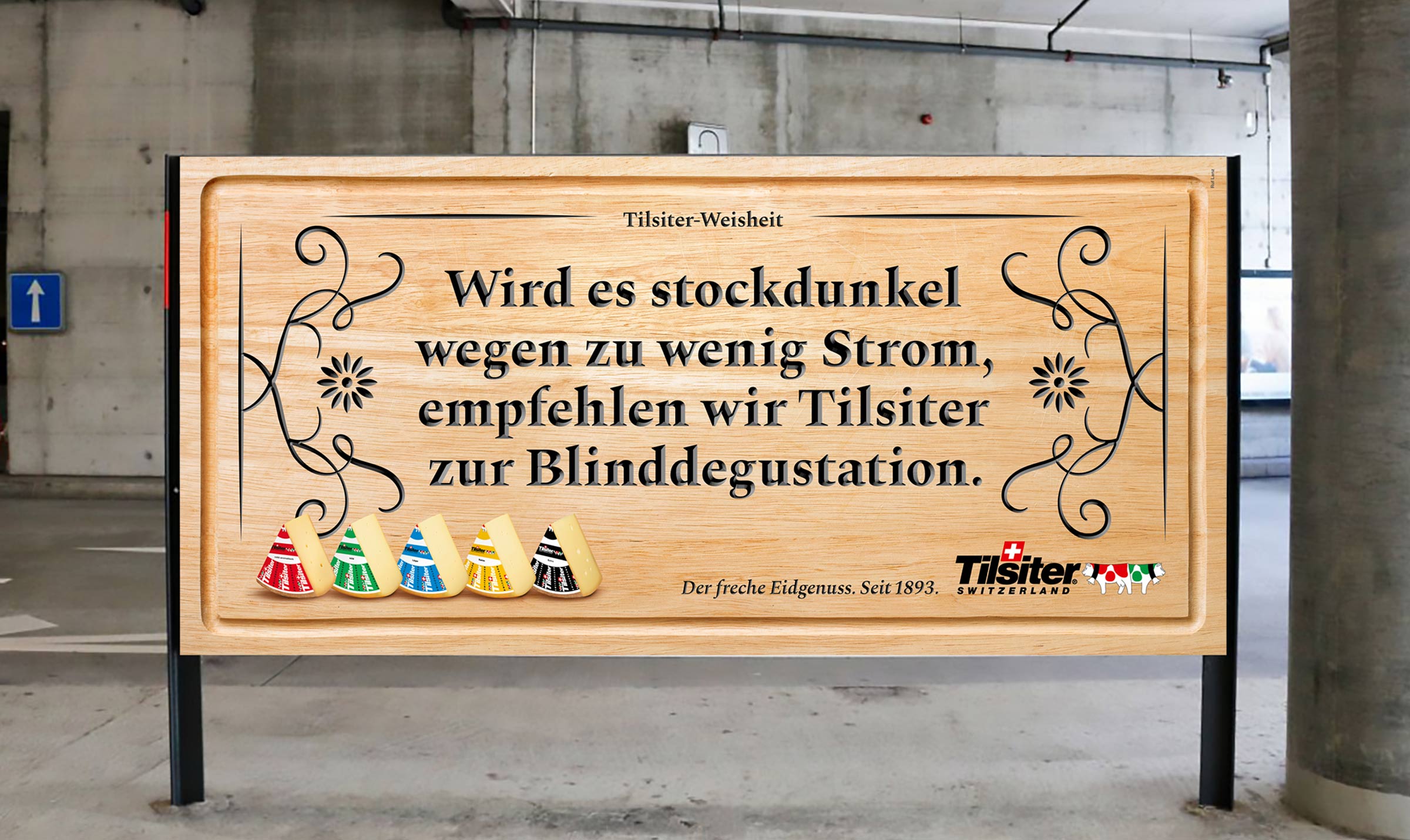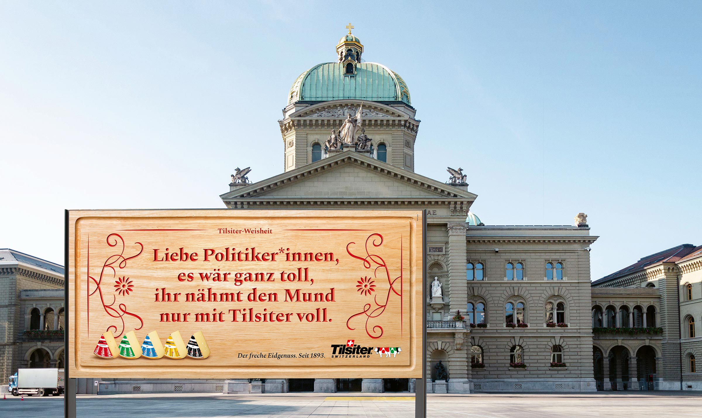 Seit Jahresanfang sind die ersten 15 Tilsiter-Weisheiten auf Plakatwänden in der ganzen Deutschschweiz zu sehen. Darunter finden sich augenzwinkernde Anspielungen auf aktuelle Ereignisse und Themen sowie standortbezogene Spezialsujets. Etwa das Strassenplakat «Vorsicht, Blitzer, langsam fahren, das Geld besser für Tilsiter sparen» oder der neckische Gruss in die urbanen Zentren: «In der Stadt sind alle trendy, bestellen den Tilsiter nur übers Handy».