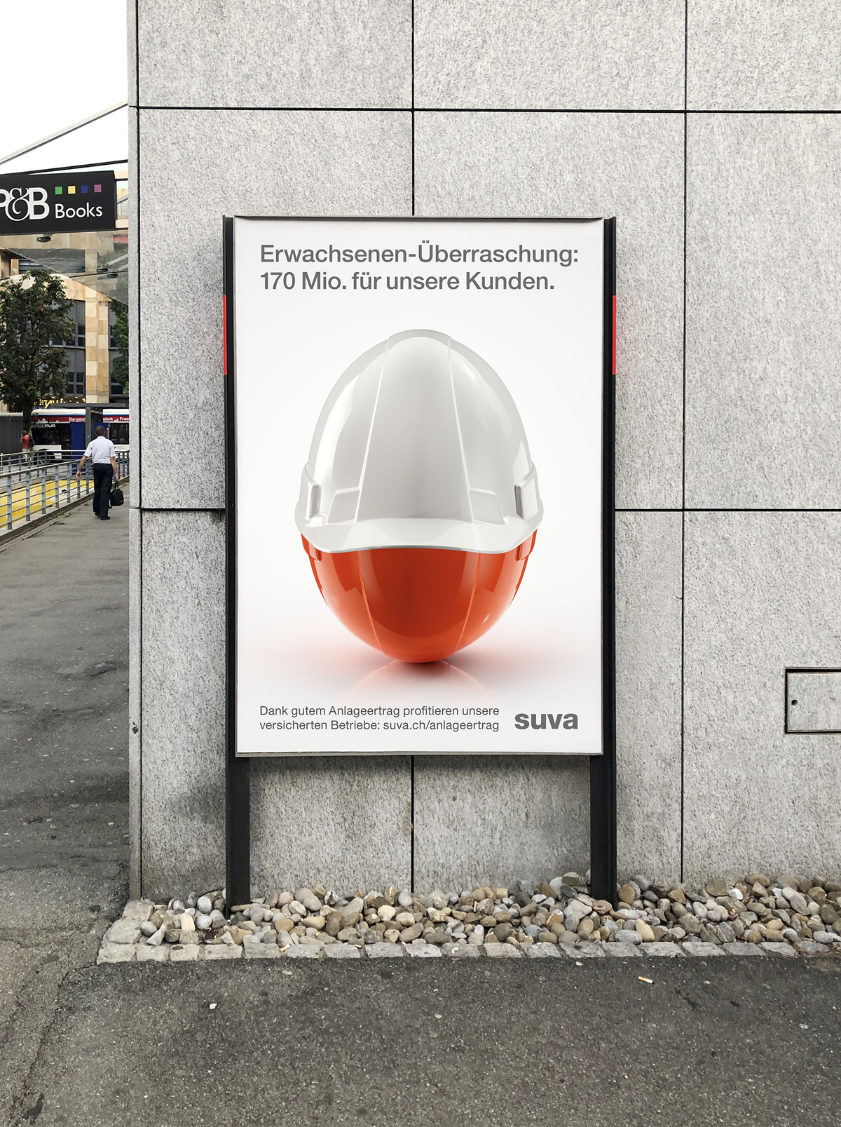 Ruf Lanz zeigt mit einer verblüffenden Analogie, dass die Betriebe Grund zur Freude haben. Zwei Bauhelme erinnern an das bekannte Überraschungsei. Die Bauhelme wurden natürlich nicht zufällig gewählt: Zum einen ist die Schweizer Baubranche bei der Suva versichert, zum anderen ist der Bauhelm ein Symbol für die grossen Präventionsanstrengungen, welche die Suva für die Arbeitssicherheit unternimmt.