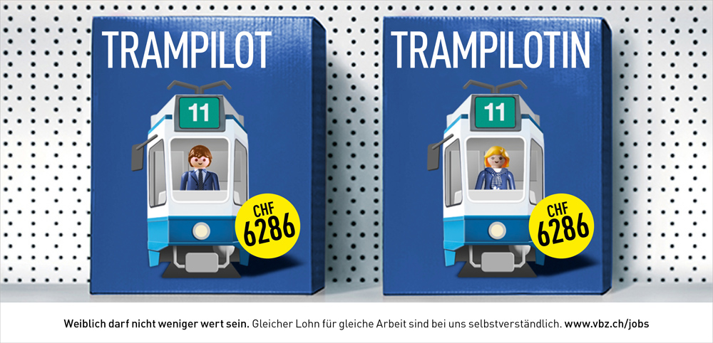 Die VBZ und ihre Kreativagentur Ruf Lanz finden die Frauenzentrale-Kampagne sehr gelungen. Nun haben sie eine Replik im Kampagnenlook der Frauenzentrale gestaltet. Das Sujet zeigt: Bei den VBZ verdient eine Trampilotin genau gleich viel wie ein Trampilot (eingesetzt wurde der reale Durchschnittslohn von CHF 6’286.-). Laut Jörg Buckmann, Leiter Personalmanagement bei den VBZ, sind auch in den anderen VBZ-Berufen gleicher Lohn für gleiche Arbeit selbstverständlich.