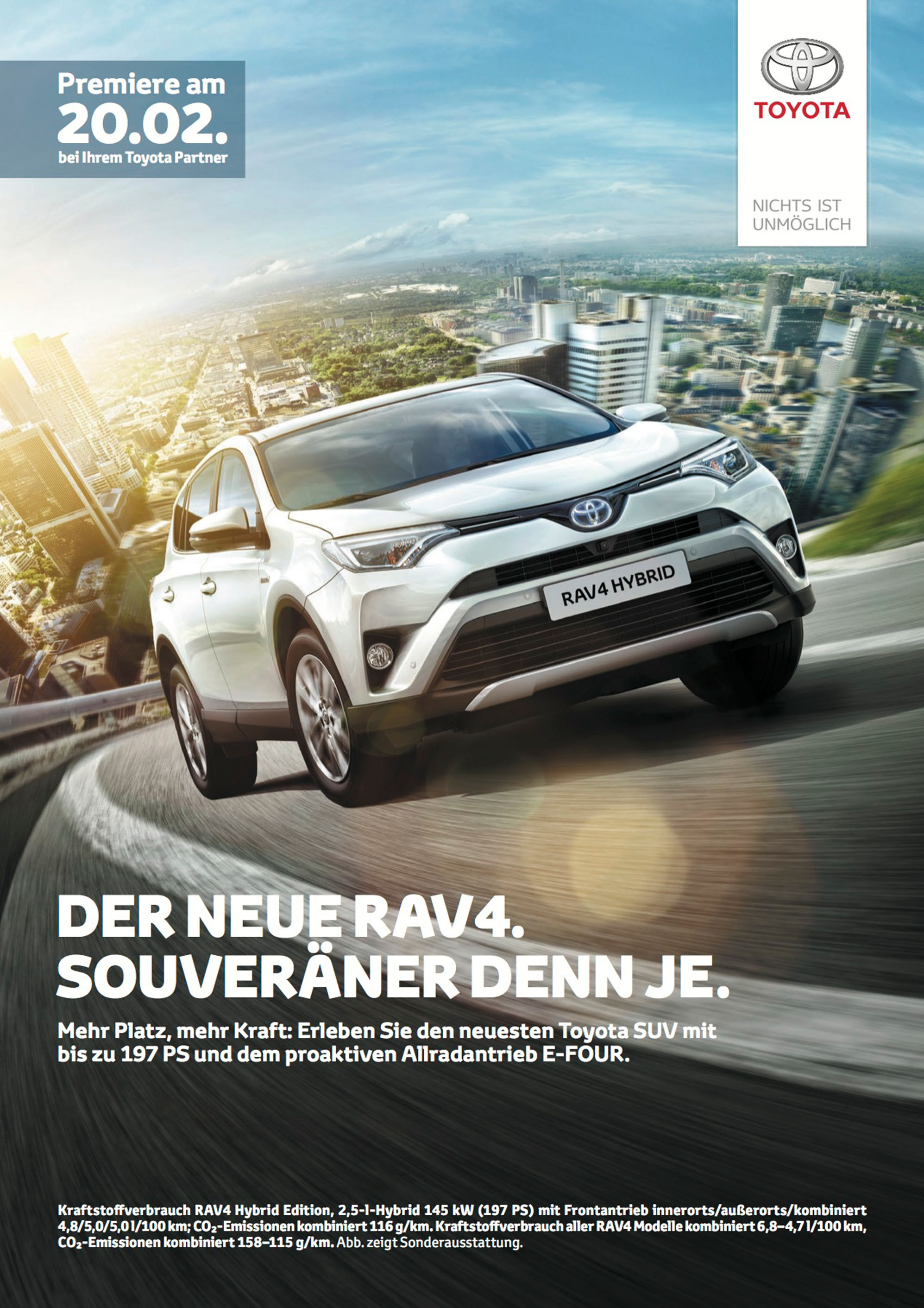 Den mit einem Song von The BossHoss unterlegten TV-Spot können Zuschauer bis zum 21. Februar deutschlandweit auf reichweitenstarken Sendern wie ARD (im Umfeld der Sportschau), RTL, Pro7, n-tv und Sky sehen. Zudem erscheinen großformatige Print-Motive in allen wichtigen Automobiltiteln wie AutoBild oder auto motor und sport sowie in Special- und General Interest-Magazinen wie Spiegel, Stern, Cicero oder dem ADAC Reisemagazin. Kunden werden auch über die eigens entwickelte Microsite toyota.de/rav4, Pre-Roll-Ads, Banner und Social Media-Maßnahmen auf den neuen Toyota RAV4 aufmerksam.