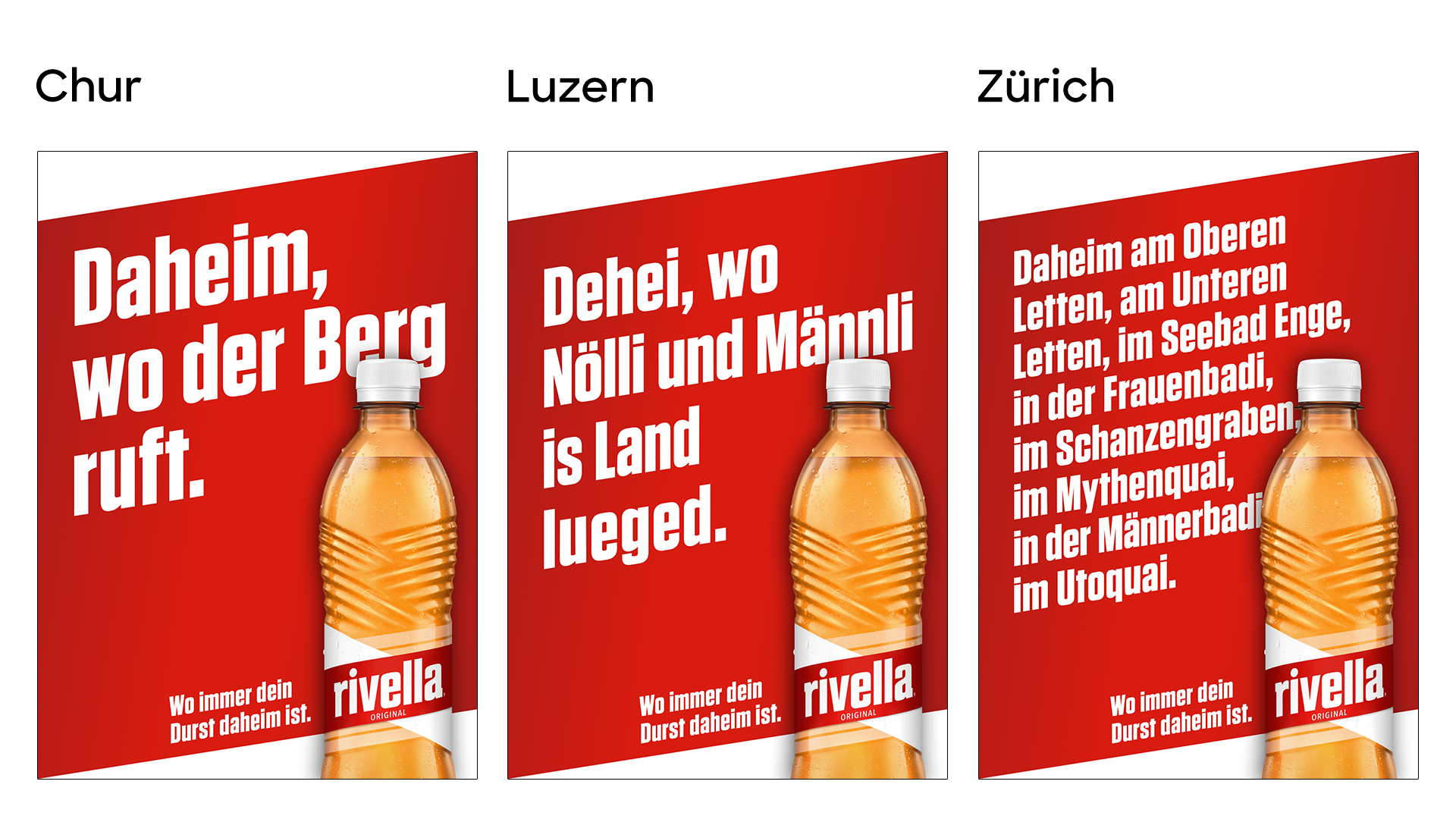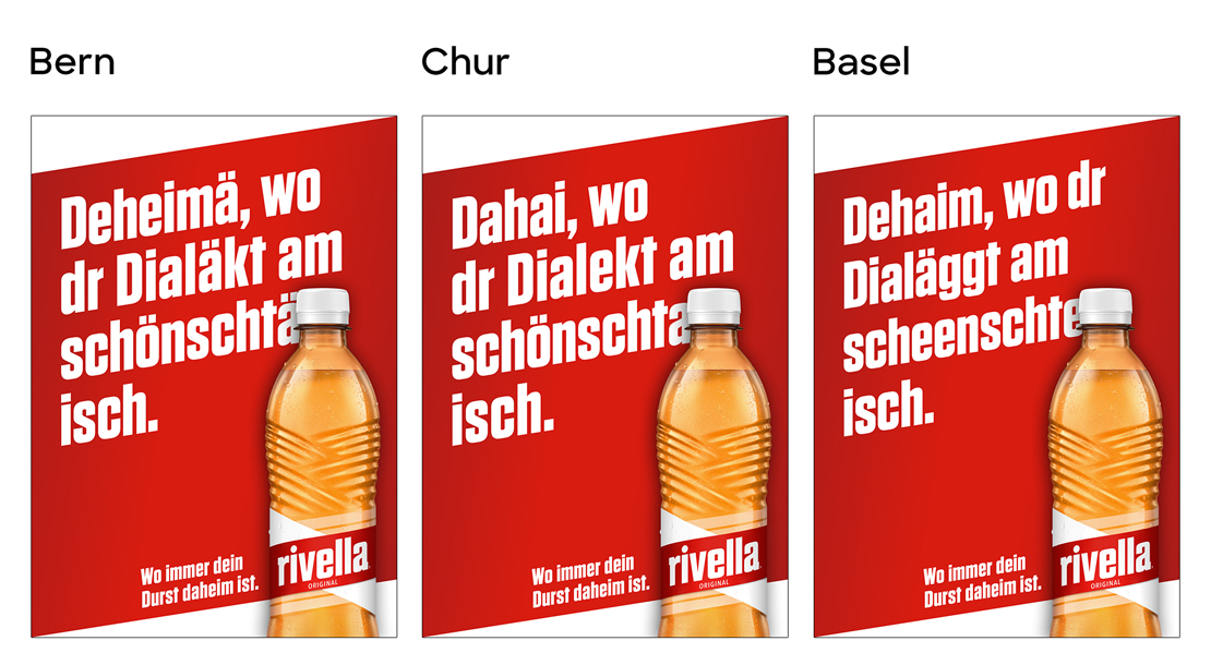 Die neue Out of Home-Kampagne von Rivella erfrischt mit regionalen Headline-Motiven, welche die Vielfalt der Schweiz und die kulturellen Eigenheiten, Leidenschaften und Aktivitäten feiern. So thematisieren sie zum Beispiel die lustigsten Dorfnamen, Zürcher Badis, den Luzerner Hausberg, St. Galler Kulinarik oder schüren den Lokalpatriotismus bei der Diskussion um den schönsten Schweizer Dialekt.