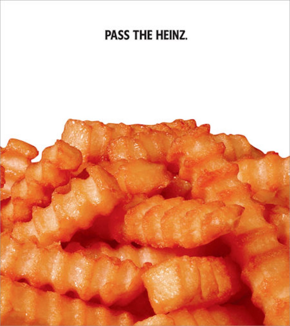«Her mit dem Heinz, ich mach‘ mein Essen rasch noch ein bisschen besser!» Ich mag das. Es ist selbstbewusst und suggeriert ein geflügeltes Wort. Die Begehrlichkeit eines Produktes zu unterstreichen, indem man es nicht zeigt, ist zwar nicht neu, funktioniert in dem Fall aber gut.