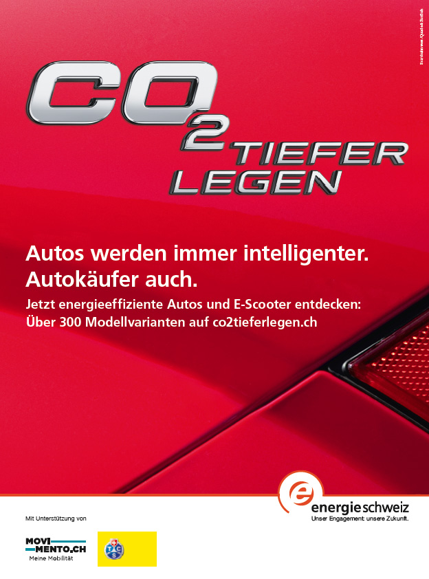 Alle sind auf der dreisprachigen Webseite co2tieferlegen.ch/co2auplancher.ch/co2ribassato.ch abgebildet, die für EnergieSchweiz exklusiv entwickelt wurde. Dort können die Fahrzeuge nach verschiedenen Kriterien gesucht werden. Herzstück der Seite ist ein TCO-Rechner (Total Cost of Ownership), der die realen Kosten des Modells nach dem individuellen Fahrverhalten aufzeigt. Die Kosten sind für potentielle Autokäufer ein gutes Argument für ein co2tiefergelegtes Fahrzeug. So kommt das Kriterium Energieeffizienz auf die Strasse.