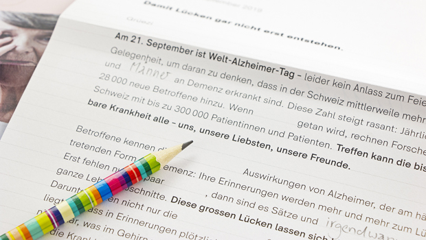 Mittlerweile sind mehr als 150 000 Frauen und Männer an Demenz erkrankt. Und diese Zahl steigt rasant, denn jährlich kommen 29 500 neue Betroffene hinzu. Forscher rechnen bis 2040 in der Schweiz mit bis zu 300 000 Patienten*. Und dies nicht zuletzt, da die Erforschung dieser Krankheit heute etwa auf dem Stand der Krebsforschung vor 20 Jahren ist. Die Stiftung Synapsis – Alzheimer Forschung Schweiz AFS engagiert sich dafür dies zu ändern. Sie unterstützt nicht-kommerzielle, junge, talentierte Forscherinnen und Forscher an Universitäten und anderen Institutionen in der Schweiz. Um dies zu finanzieren, ist die Stiftung Synapsis auf Spenden angewiesen. Nach der international mehrfach ausgezeichneten Spendenkampagne im vergangenen Jahr durfte die Agentur anlässlich des Welt-Alzheimer-Tags die letztjährige Fundraising-Kampagne weiterentwickeln. Das neue Mailing dramatisiert den Verlauf der Krankheit durch Lücken im Text, die das Lesen des Briefes massiv erschweren. Um dem Ganzen einen Sinn zu geben, wurde ein Bleistift zum Eintauchen und Vervollständigen des Lückentextes sowie ein Einzahlungsschein zum sofortigen Spenden in das DirectMail integriert. Das Mailing forderte rund 1 Mio. Schweizer Haushalte zum Spenden auf, damit erst keine Gedächtnislücken entstehen und möglichst bald wirkungsvolle Therapien gegen diese «Volkskrankheit» entwickelt werden können.
