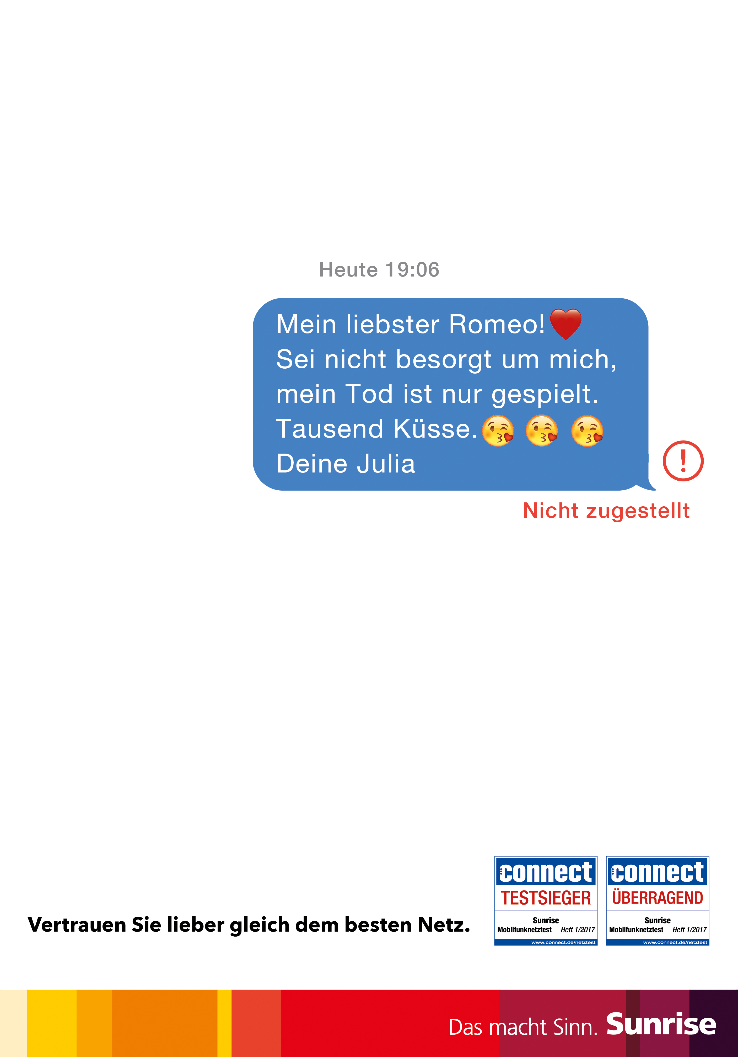 Mit einer gezielt auf Theaterliebhaber zugeschnittenen Kampagne erinnert Sunrise augenzwinkernd an den Connect-Testsieg für das beste Mobilfunknetz. Und beweist Humor.