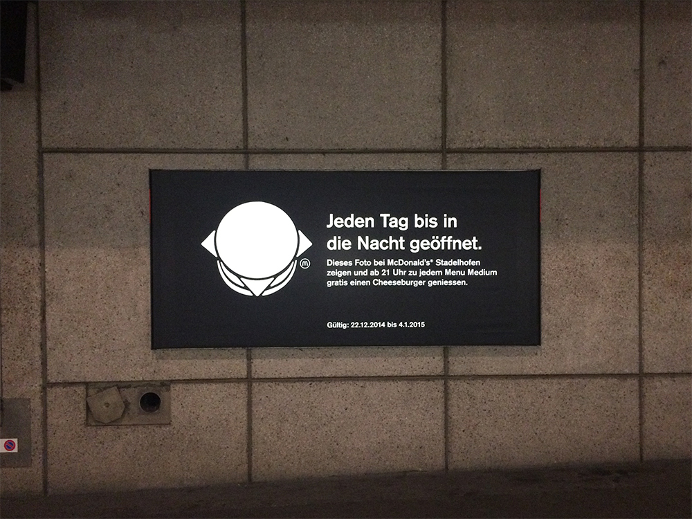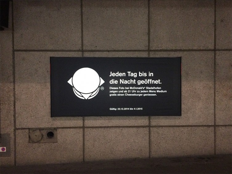 Das erste Blitzplakat hing vom 22. Dezember 2014 bis 4. Januar 2015 unmittelbar in der Nähe des McDonald’s Stadelhofen. Weitere Plakatstandorte für 2015 sind in Planung.