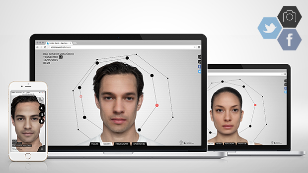 Eine Gesichtserkennungssoftware wurde so programmiert, dass sie Gesichter erkennt und mit jedem zusätzlichen Foto direkt ein neues Gesamtgesicht rendert, das sich ständig verändert. Die mehr als 100 Nationen im Kanton sorgen so für eine ständig ändernde Identität Zürichs.