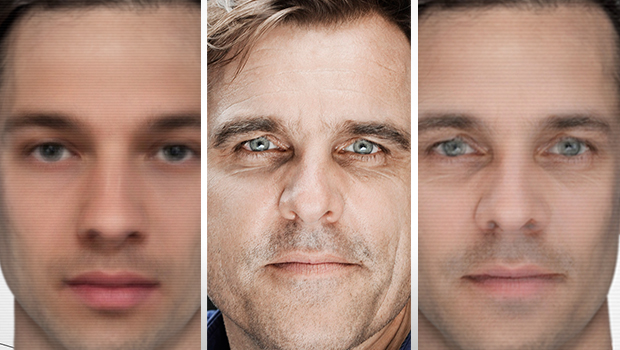 Veränderung Schritt für Schritt: 1. Aktuelles Gesicht. 2. Teilnehmer Daniel Rohr, Theaterleiter und Schauspieler. 3. Ein neues gemeinsames Gesicht entsteht.