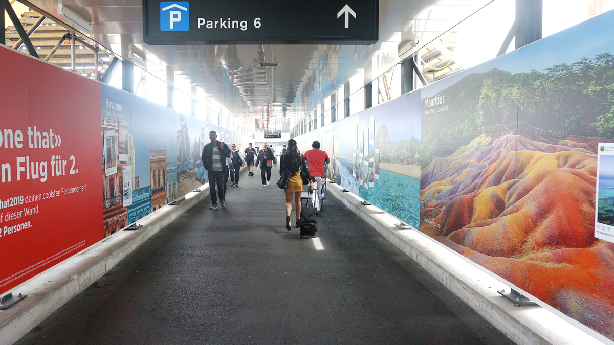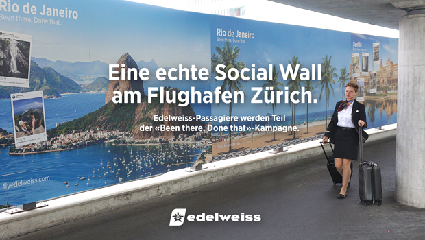 Nun werden in einer Promotion die Reisenden in die Angebots-Kommunikation der Ferien-Airline eingebunden. Dazu lässt thjnk Zürich Social Media mit physischer Plakatwerbung verschmelzen: Wer ein schönes Ferienbild von einer der 70 Edelweiss-Destinationen mit den Hashtags #flyedelweiss und #DoneThat2019 teilt, dessen Instagram-Post wird ausgedruckt und als kleines Plakat an die 125 Meter lange Passagenwand zwischen Parkhaus P6 und Terminal 1 gehängt. So kommen über die mehrmonatige Laufzeit des Aushangs alle zwei Wochen neue, inspirierende Ferienbilder von authentischen Urlaubern an die von Reisenden wie auch Shoppingtouristen stark frequentierte Wand. Nebst der physischen Präsenz werden die Urheber der Bilder in ihren eigenen sozialen Kanälen durch die Hashtags automatisch zu digitalen Edelweiss-Werbebotschaftern. All das wird natürlich belohnt: Unter sämtlichen Teilnehmern, die ihre Bilder zur Verfügung stellen, werden Langstreckenflüge verlost – damit in den nächsten Ferien wieder neue «Done thats» kreiert werden können.
