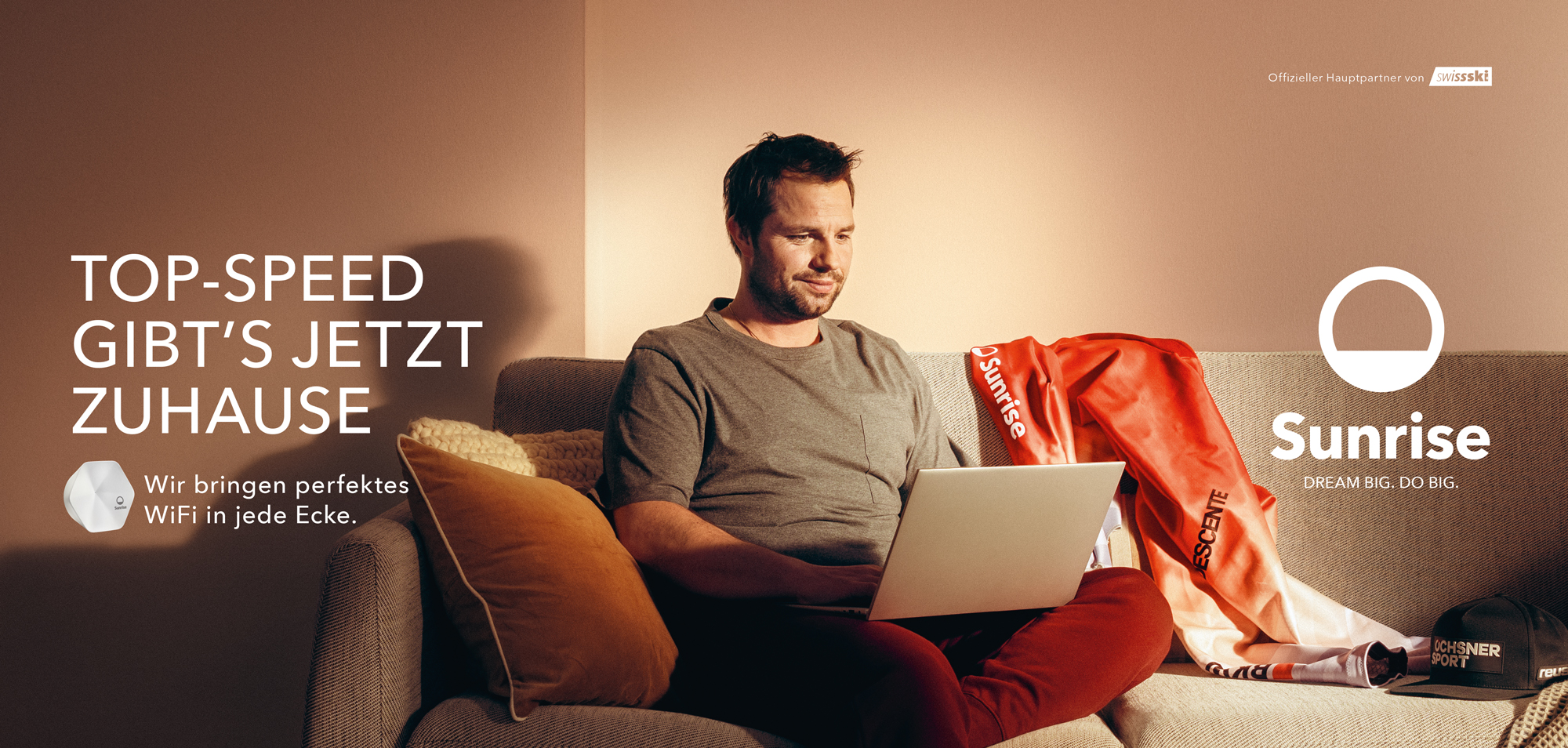 Mit intelligenten Connect-Pods sorgt der Telco-Anbieter Sunrise bei Bedarf dafür, dass Kundinnen und Kunden in jeder Ecke ihres Zuhauses mit Top-Speed ins Internet können. Um diese perfekten WiFi-Resultate zu bewerben, wurde ein Testimonial gewählt, das sich mit Top-Speed auskennt: Beat Feuz, der Schweizer Skirennfahrer mit den meisten Podestplätzen in Weltcup-Abfahrten.