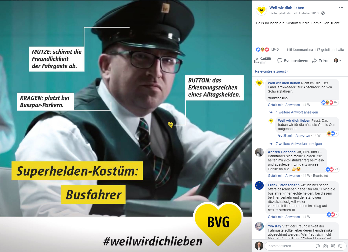 Ich finde die Kampagne „Weil wir Dich lieben“ der Berliner Verkehrsbetriebe extrem spannend. Einerseits, weil ein „ÖV-Anbieter“ normalerweise nicht wirklich sexy ist und andererseits, weil es die Berliner Verkehrsbetriebe mit ihrer schlagfertigen, sarkastischen und sich selbst nicht wirklich ernstnehmenden Kommunikation immer wieder schaffen zu überraschen, den Menschen ein Schmunzeln abzugewinnen und gleichzeitig sehr viel Aufmerksamkeit schaffen. Chapeau für die wirklich hochstehende Arbeit in einem äusserst schwierigen Themenfeld.