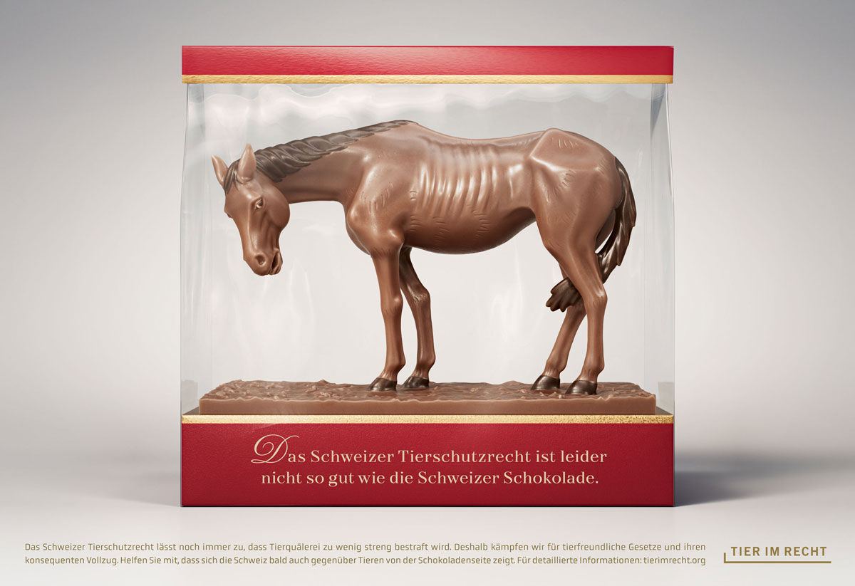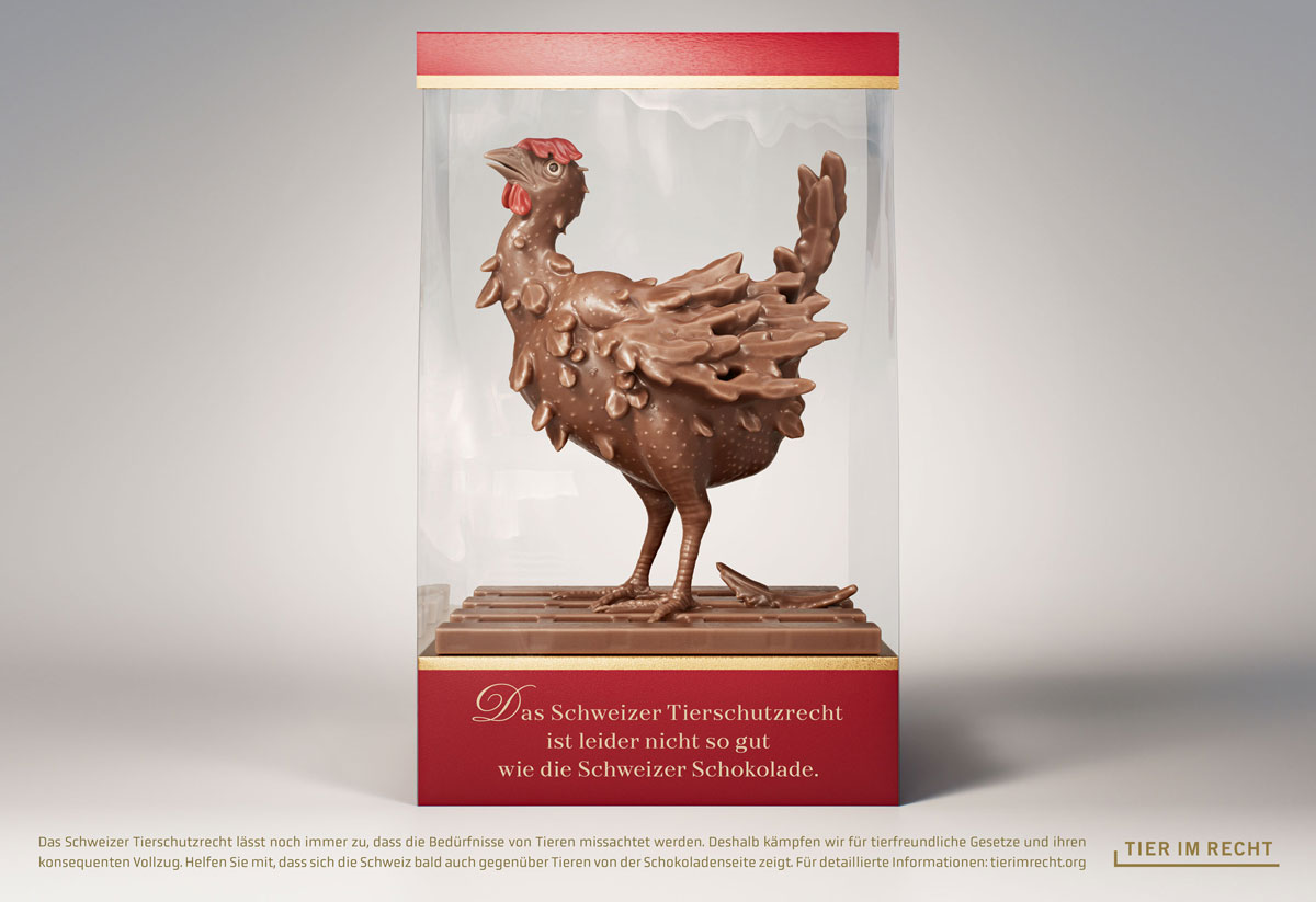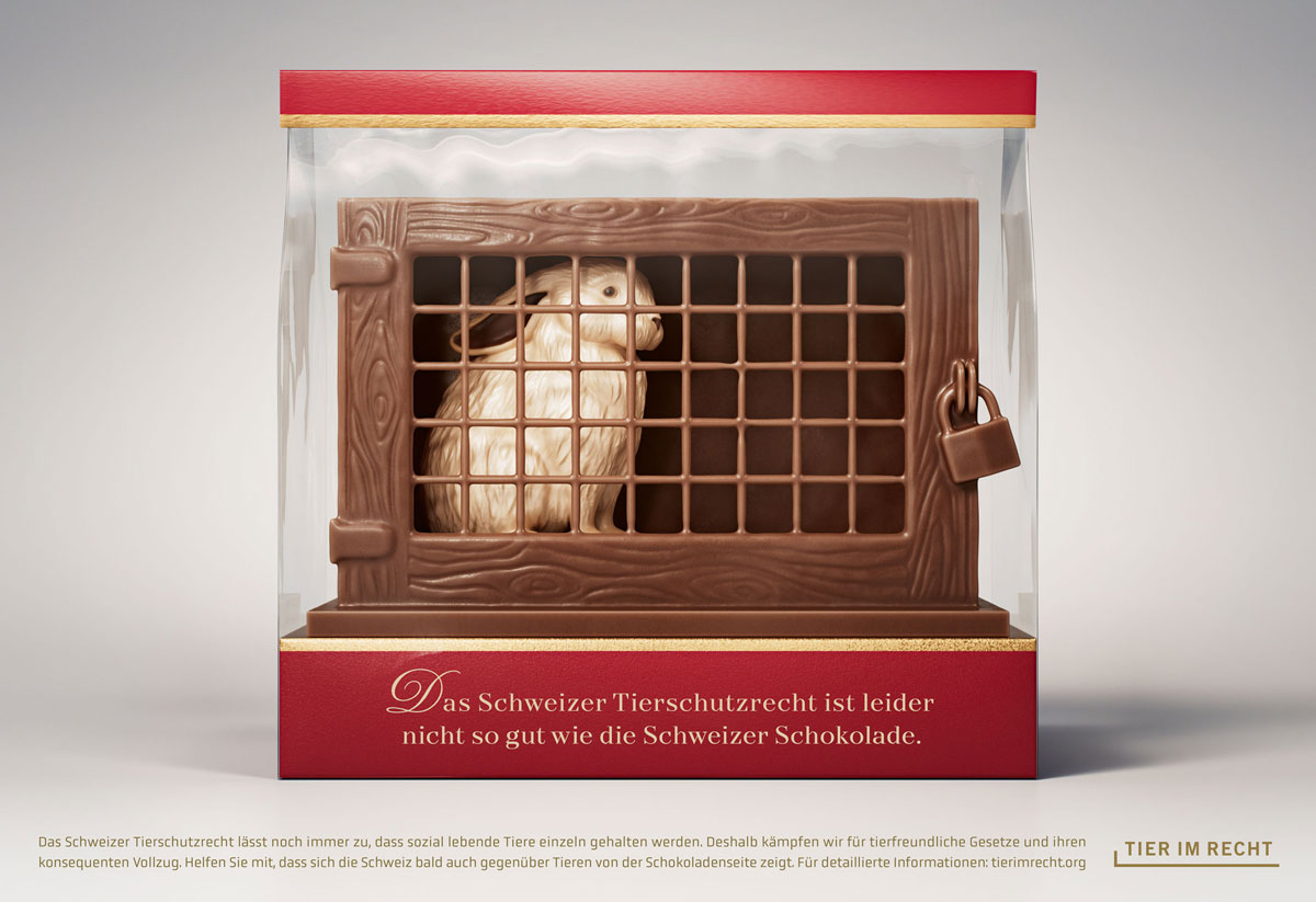 «Das Schweizer Tierschutzrecht ist leider nicht so gut wie die Schweizer Schokolade», lautet deshalb die Botschaft der prägnanten neuen Kampagne von Ruf Lanz. Durch Schokoladentiere in erbärmlichem Zustand wird die leidvolle Realität abgebildet, die sich hinter der schönen Verpackung verbirgt.