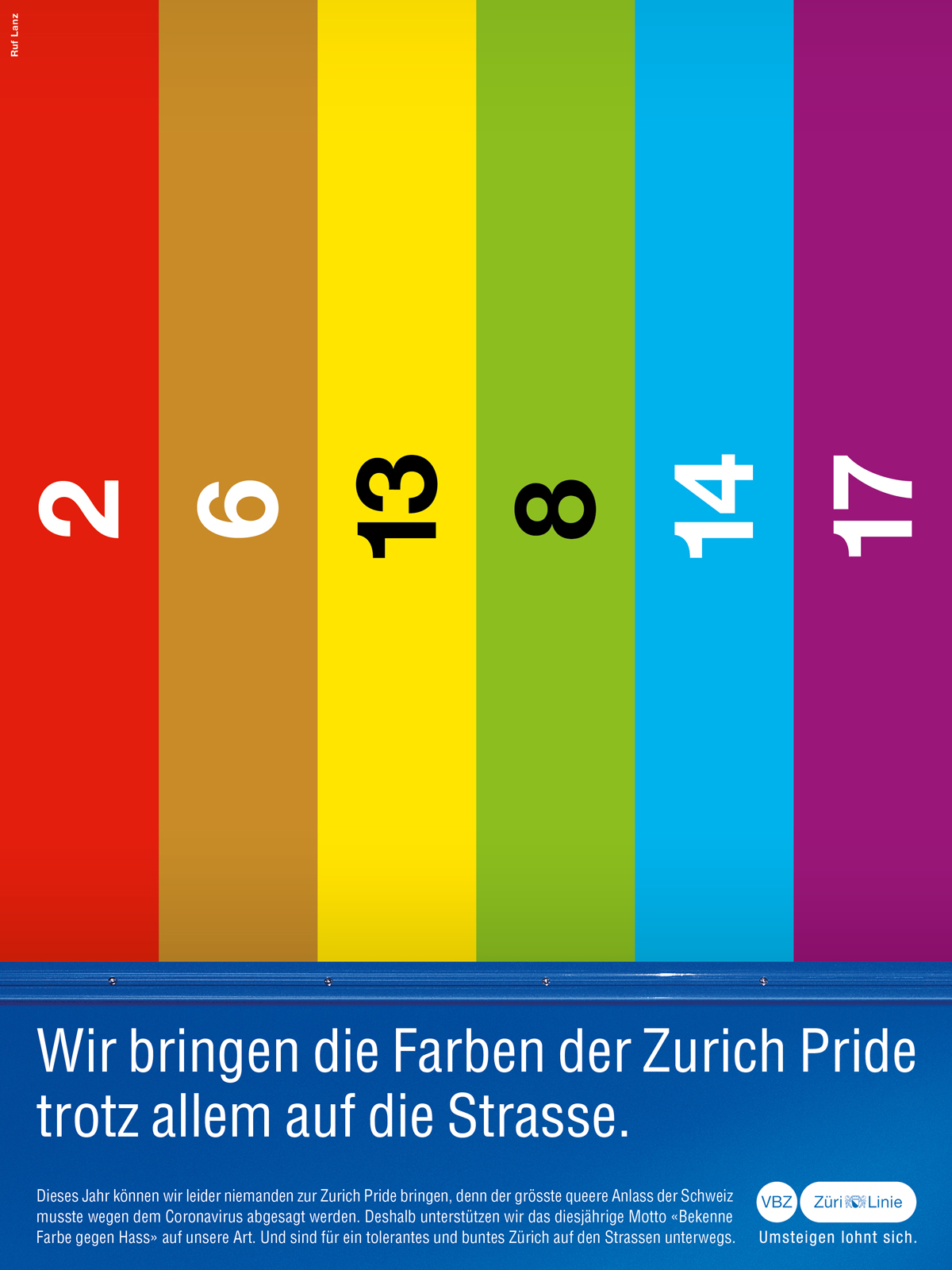 Deshalb bringen die VBZ die Farben der Zurich Pride auf ihre eigene Art auf die Strasse: mit einer Kampagne von Ruf Lanz, der langjährigen Leadagentur der VBZ. Ein prägnantes Bekenntnis zu einem toleranten, offenen und bunten Zürich. Auf Anzeigen in der grössten Schweizer Zeitung „20 Minuten“ und in den sozialen Netzwerken. Die Kampagne wird unterstützt durch einen Beitrag auf Vbz.jobs, in dem die VBZ auf den unternehmenseigenen LGBTIQ-Verein «Pink Line» aufmerksam machen.