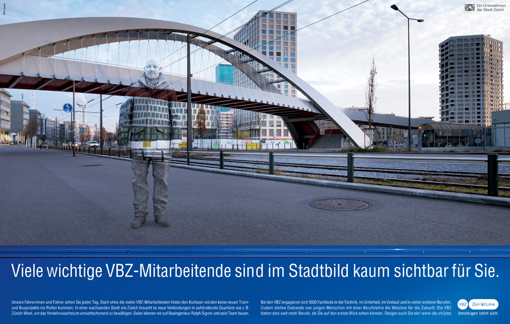 Als Sieger ausgezeichnet wurde die Kampagne «Unsichtbare VBZ-Talente», Seiler’s Werbeblog berichtete über die Kampagne (hier nachzulesen). Der Hintergrund: Fast 1’000 von rund 2’400 VBZ-Mitarbeitenden lenken weder Bus noch Tram und sind für die Bevölkerung kaum sichtbar. Weil die VBZ jedes Jahr gegen 100 solche unsichtbare Talente für sich gewinnen wollen, stellte Ruf Lanz vier von ihnen in den Mittelpunkt der Personalkampagne. Die Mitarbeitenden wurden mit viel Liebe zum Detail bemalt, bis sie mit dem Zürcher Stadtbild verschmolzen.