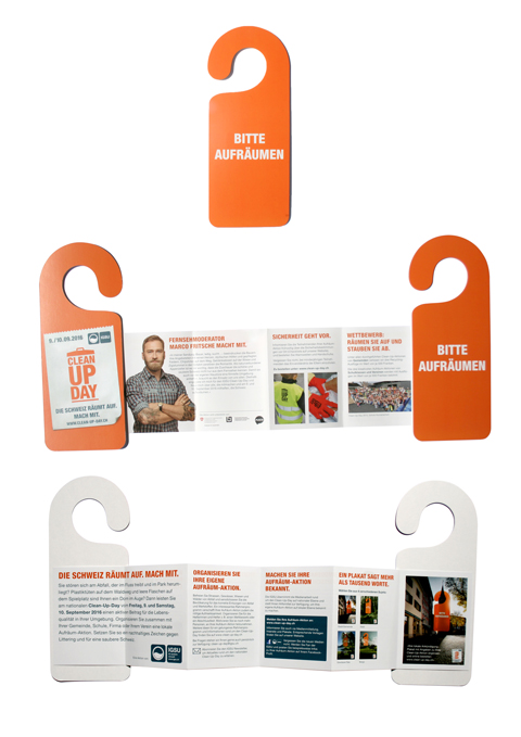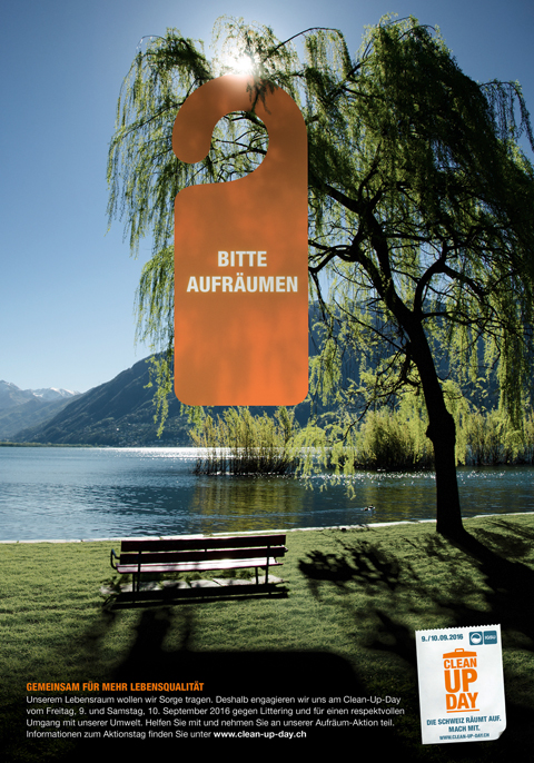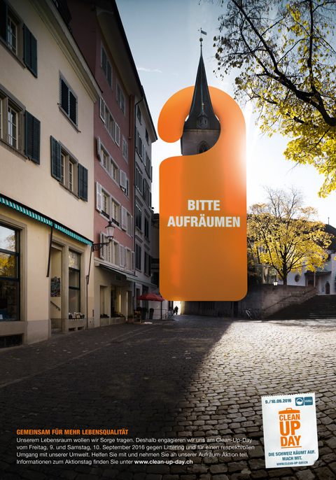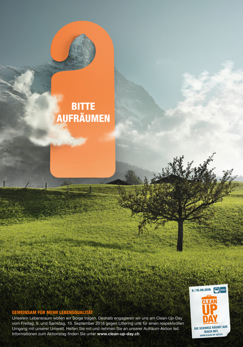Im Zentrum der entstandenen Kampagne steht das Key-visual des bekannten Türhängers mit der Botschaft «Bitte aufräumen». In verschiedenen Sujets fordert es in typischen Schweizer Landschaften überdimensional und auffällig dazu auf, beim Clean-Up-Day mitzumachen. Gleichzeitig wirkt der Türhänger als origineller Info-Flyer, der als Guerilla-Massnahme überall verteilt, respektive aufgehängt werden kann. Die Kampagne ist ab sofort schweizweit mit Plakaten, Anzeigen und einem Info-Flyer präsent.