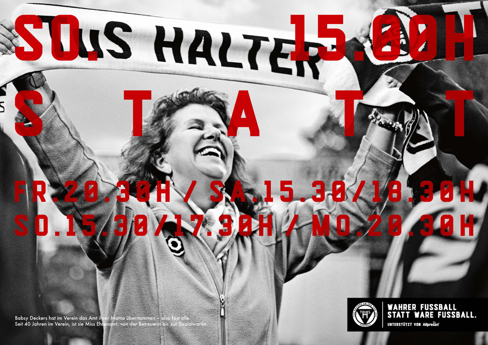 Die Kampagne, die sich durchaus recht provokant gegen die Kommerzialisierung im Profifussball positioniert, war am vergangenen Wochenende vor allem sichtbar im Umkreis der Stadien von Schalke 04, RB Leipzig, VfL Wolfsburg und Leverkusen. In einer Guerilla Aktion wurden die am meisten frequentierten Wege zum Stadion hin mit den Motiven plakatiert.