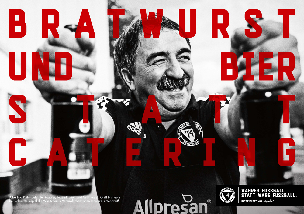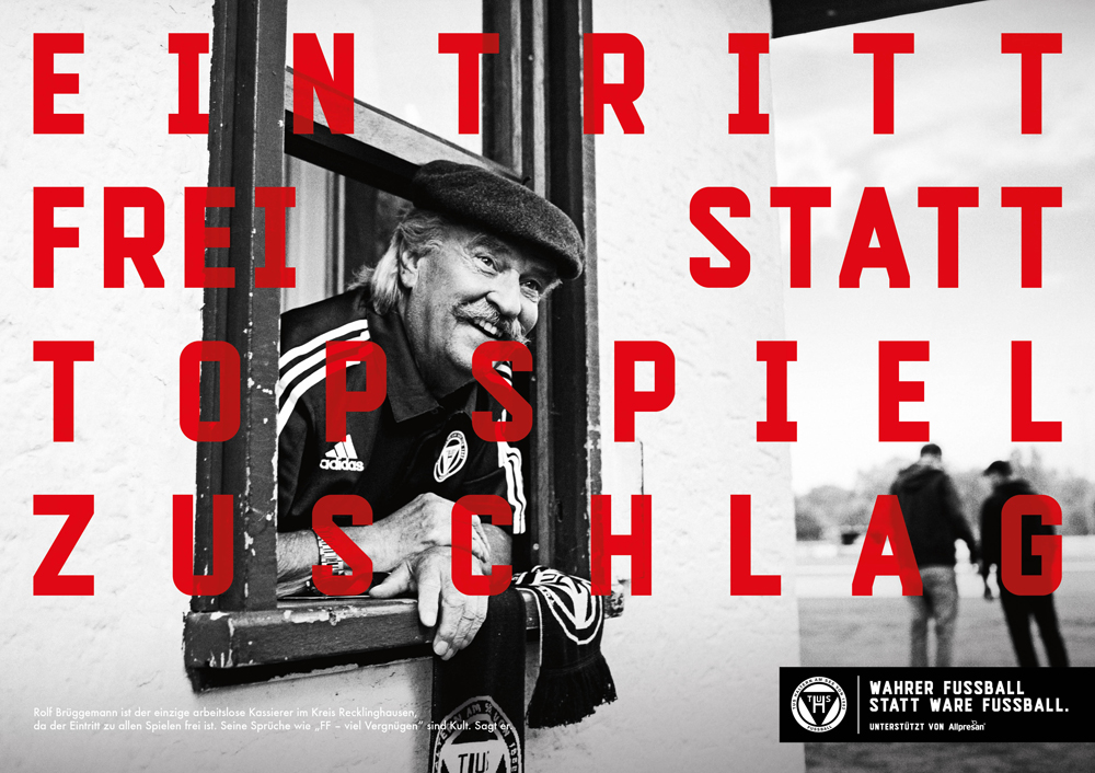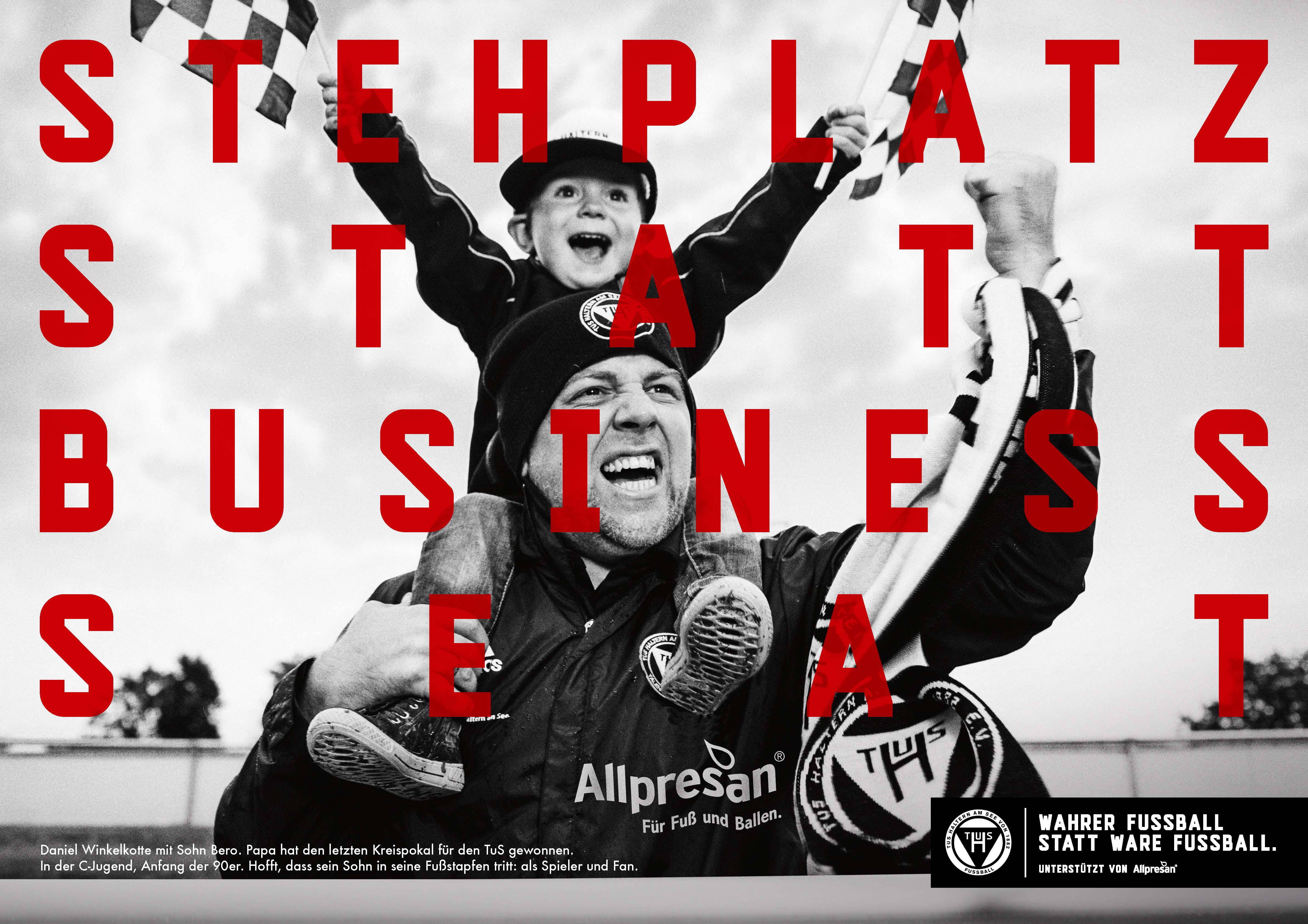 Auf den Motiven mit Headlines wie „Stehplatz statt Business Seat“, „Spieler statt Söldner“ oder „Bratwurst und Bier statt Catering“ sind durchweg Protagonisten aus dem Ruhrgebiets-Verein und dem Umfeld zu sehen. „Die Motive sind eine Liebeserklärung an den Amateurfußball und unsere Ehrenämtler, Trainer und Spieler, die sich Woche für Woche in den Dienst von Verein und Mannschaften stellen.“ so Christoph Metzelder, der als erster Vorsitzender und Trainer der U19 beim TuS Haltern einer der Initiatoren der Kampagne ist.
