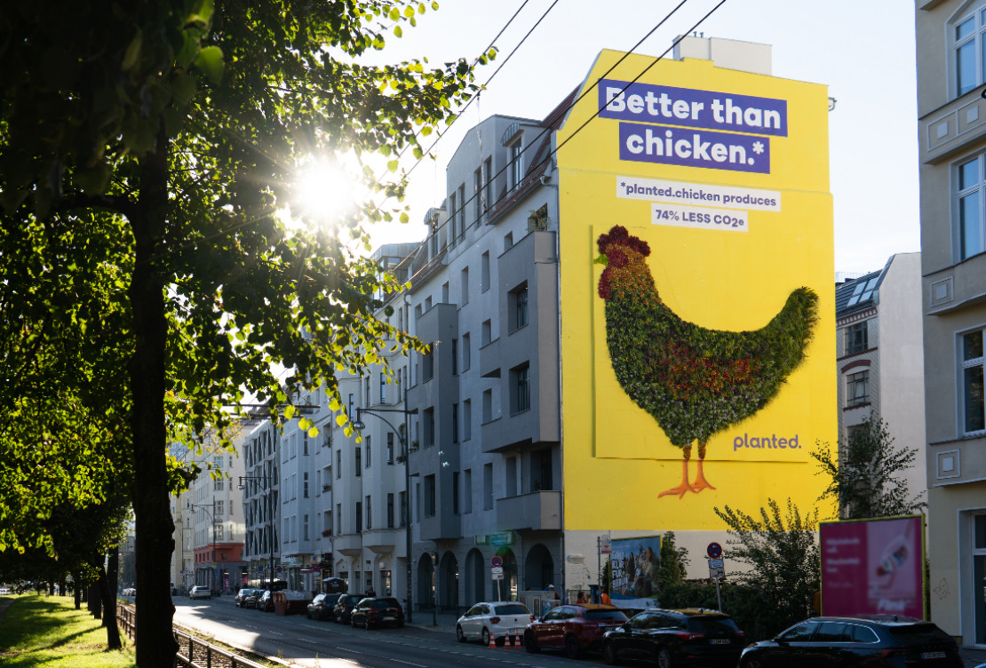 Es lebt! Mit einer überdimensionalen Kunstinstallation aus echten Pflanzen in Form eines Huhns sorgen FOUNDRY, in Zusammenarbeit mit XI DE SIGN, und planted in Berlin für Aufsehen. Auf vollen 100-Quadratmetern entstand ein Huhn aus echten Pflanzen. Die überdimensionierte Installation an der Hauswand der Greifswalder Straße 223 ist Blickfang und innovativer Denkanstoß zugleich. Am 9. und 10. Oktober fand eine Verkostungsaktion mit dem planted-Foodtruck vor der Wandinstallation statt. Neugierige konnten sich vom Geschmack des planted.chicken überzeugen.
