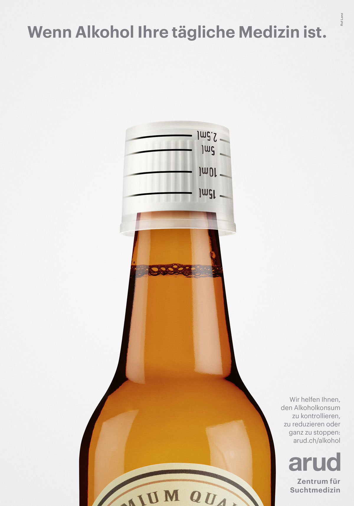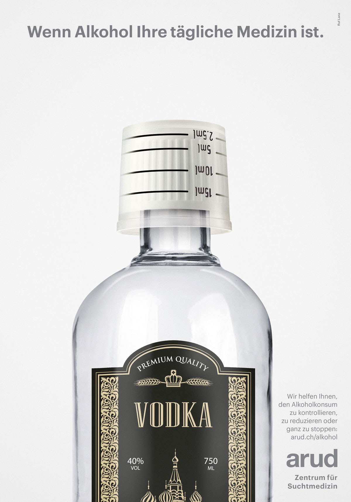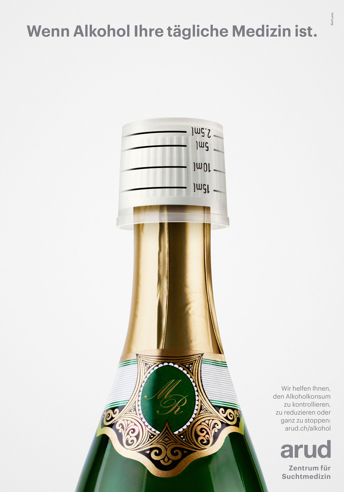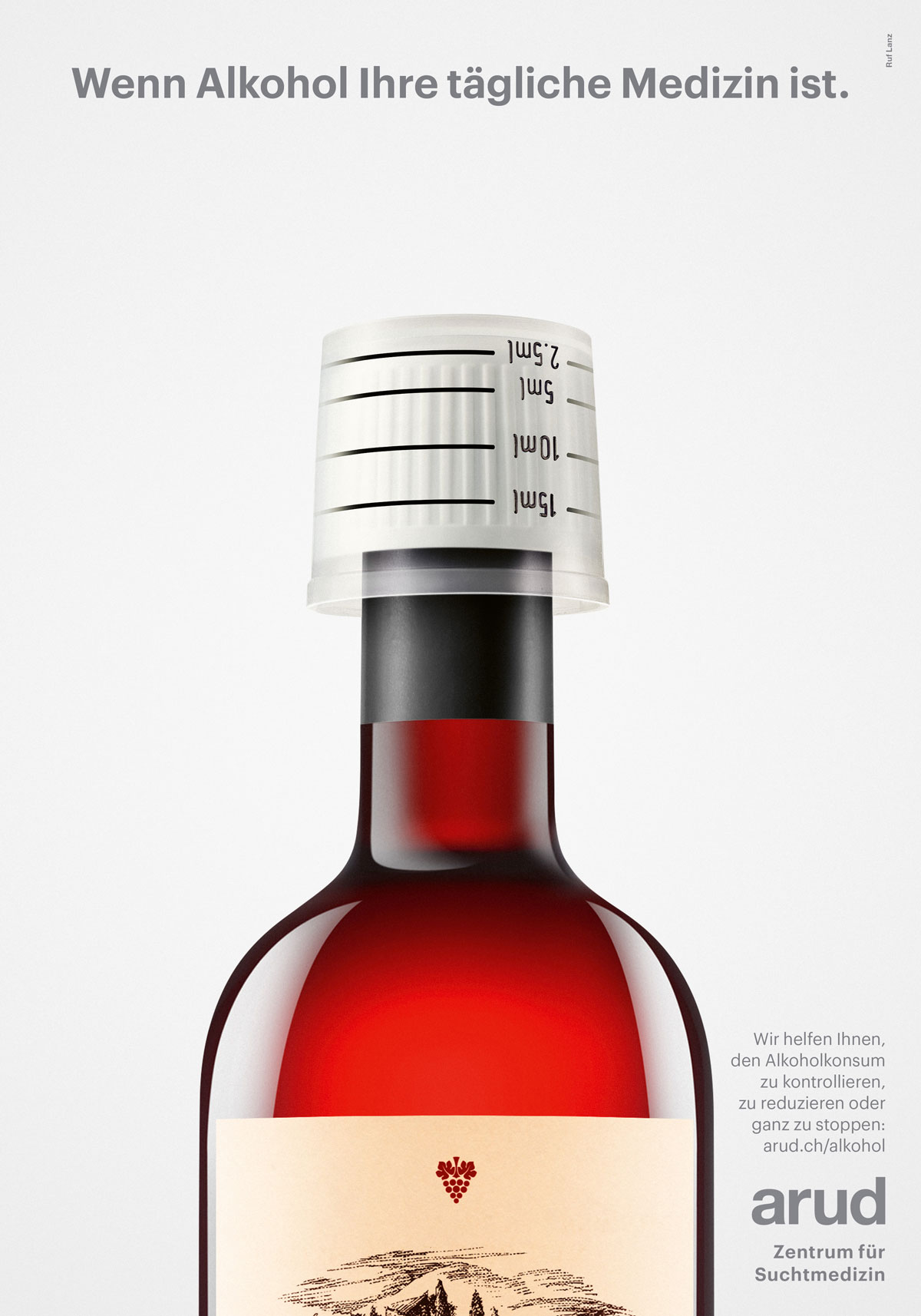 «Wenn Alkohol Ihre tägliche Medizin ist», lautet deshalb der Slogan der neuen Kampagne. Überraschend inszeniert mit vier häufig konsumierten Alkoholika, auf denen ein medizinischer Messbecher steckt. «Eine Abweichung von der Norm, die entsprechend auffällt und glasklar begründet ist», so Creative Director Markus Ruf.