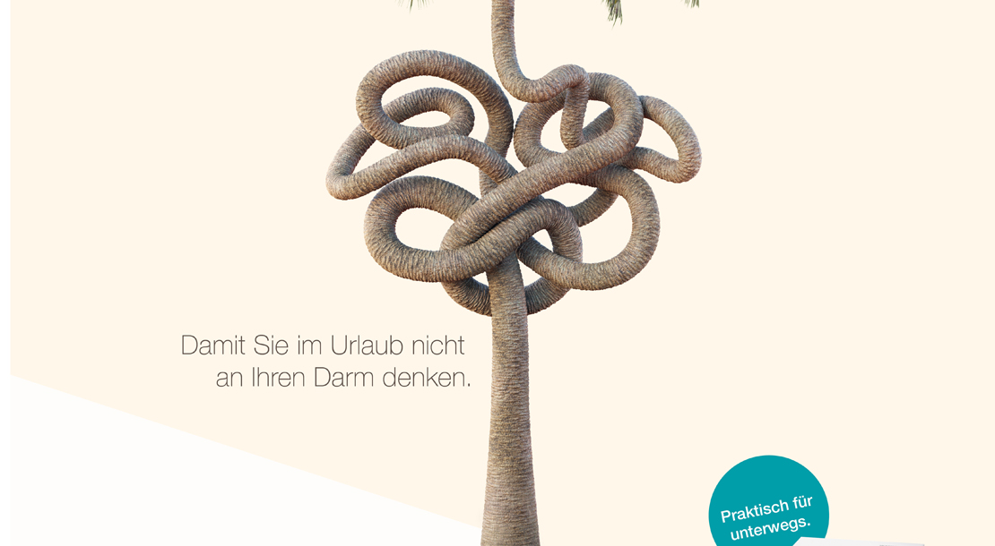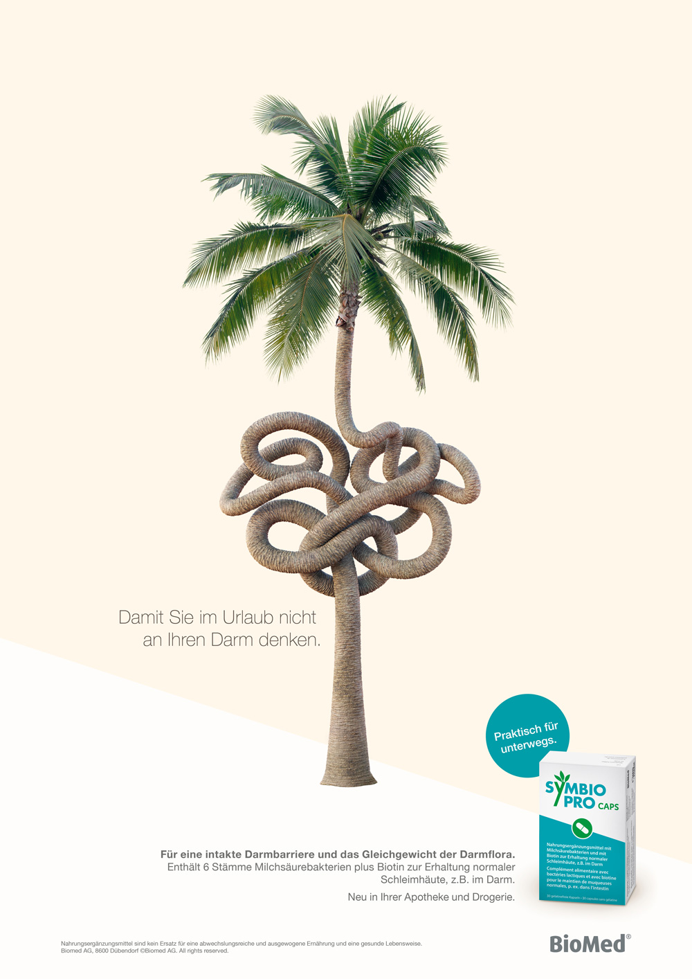 Jeder weiss, dass bereits kleine Darmverstimmungen schnell den Kopf von der Arbeit, einem Date oder erholsamen Ferien ablenken können. Nachdem Kommunikation im Pharma-Bereich allzu oft dem gleichen Muster folgt, ist TBWA\Zürich für die Markteinführung des Nahrungsergänzungsmittels SymbioPro Caps einen etwas unkonventionelleren Weg gegangen. Anstatt Menschen mit verzerrtem Gesichtsausdruck, die sich den Bauch halten zu zeigen, lässt TBWA\ über die gelernte Darmform kleine Geschichten erzählen.