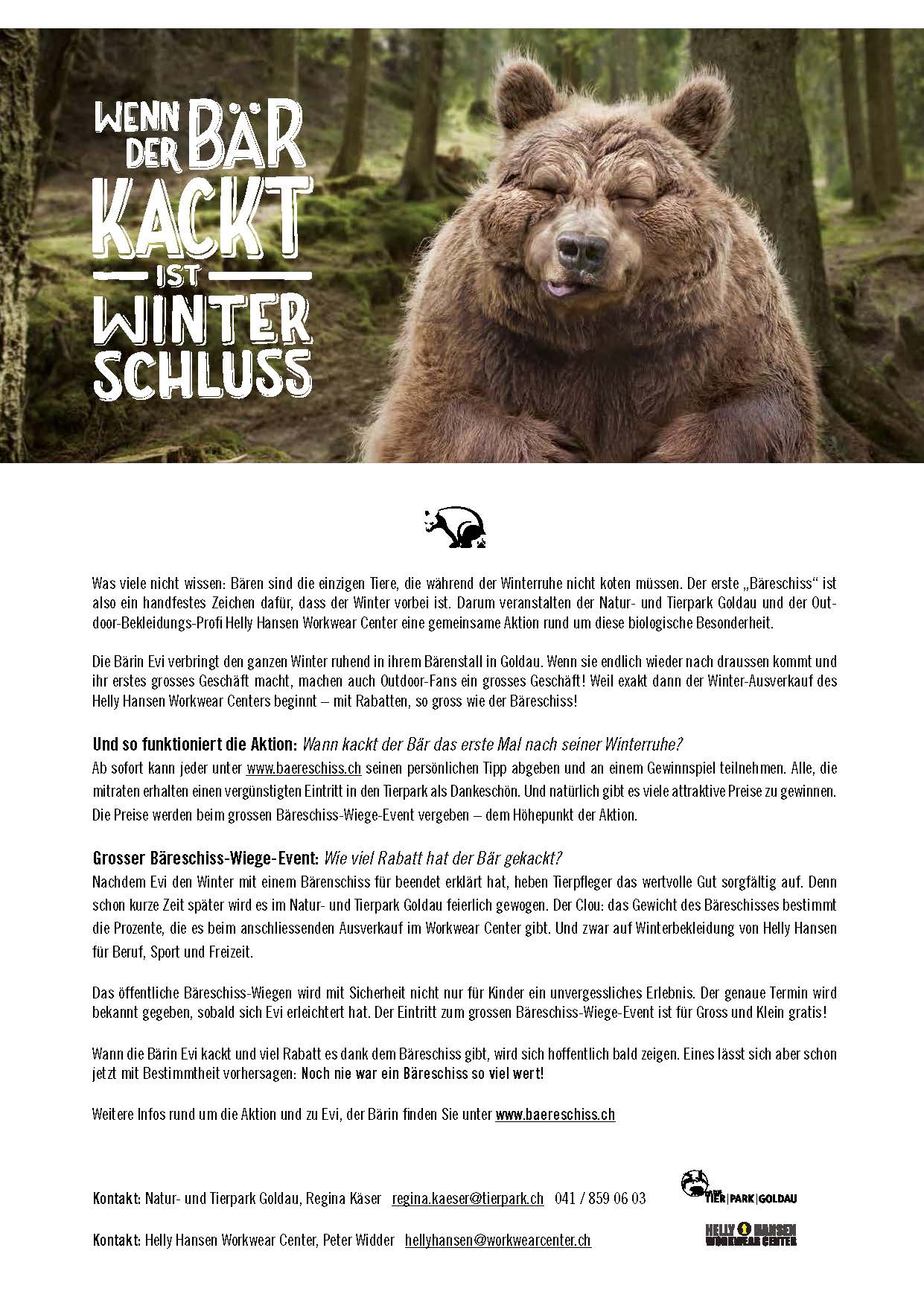 Danach wird beim grossen Bäreschiss-Wiege-Event das Gewicht von Evis Haufen bestimmt. Der Clou: Das Gewicht des Bärenschiss bestimmt die Prozente, die man beim anschliessenden Winterschlussverkauf beim Helly Hansen Workwear Center erhält. Der Eintritt zum grossen Wiege-Event ist natürlich frei.