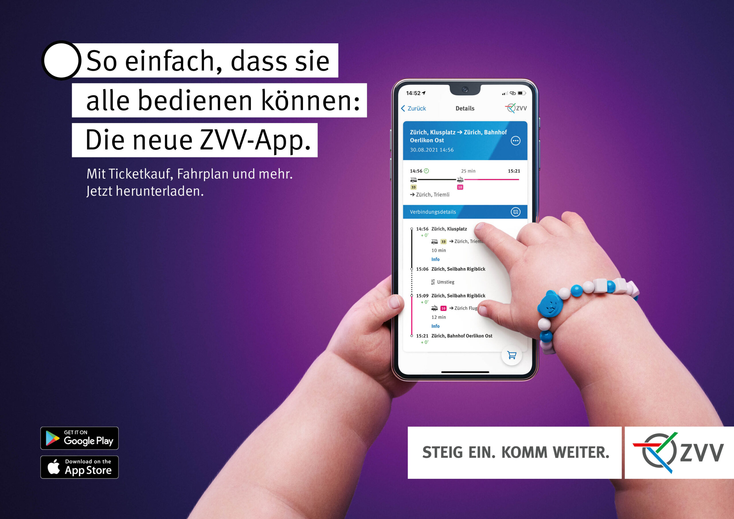 Immer mehr ÖV–Benutzer*innen lösen ihr Billet nicht mehr am Automaten, sondern per Smartphone. Mit der neuen ZVV App geht das unkomplizierter denn je. Während zuvor für den Ticketkauf und den Fahrplan zwei separate Apps verwendet werden mussten, werden die beiden Funktionen nun in einer App vereint. Zusätzlich wurde die Benutzeroberfläche überarbeitet und noch einfacher gestaltet. So einfach, dass es jetzt kinderleicht ist, in Zürich mit dem ÖV unterwegs zu sein. In der von Serviceplan Suisse erarbeiteten Werbekampagne sogar wortwörtlich: Auf dem Sujet wird die neue ZVV App von einem Baby bedient.